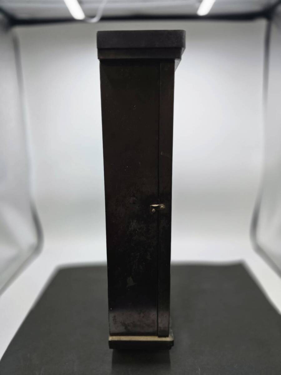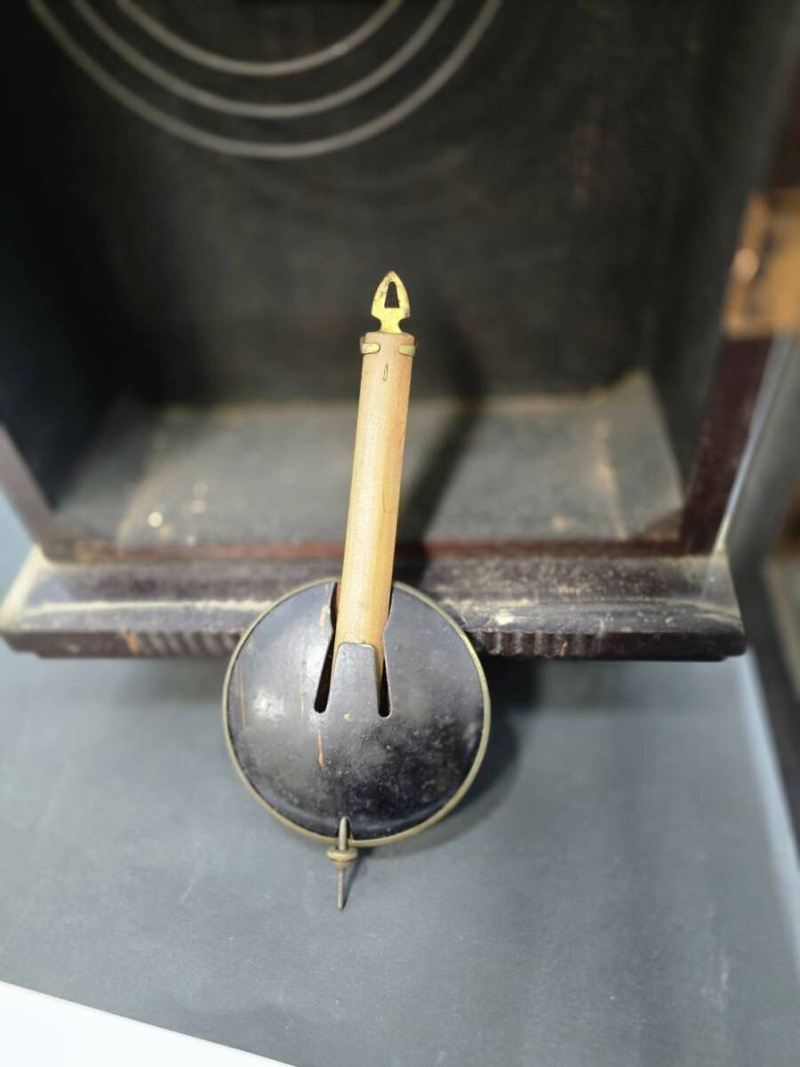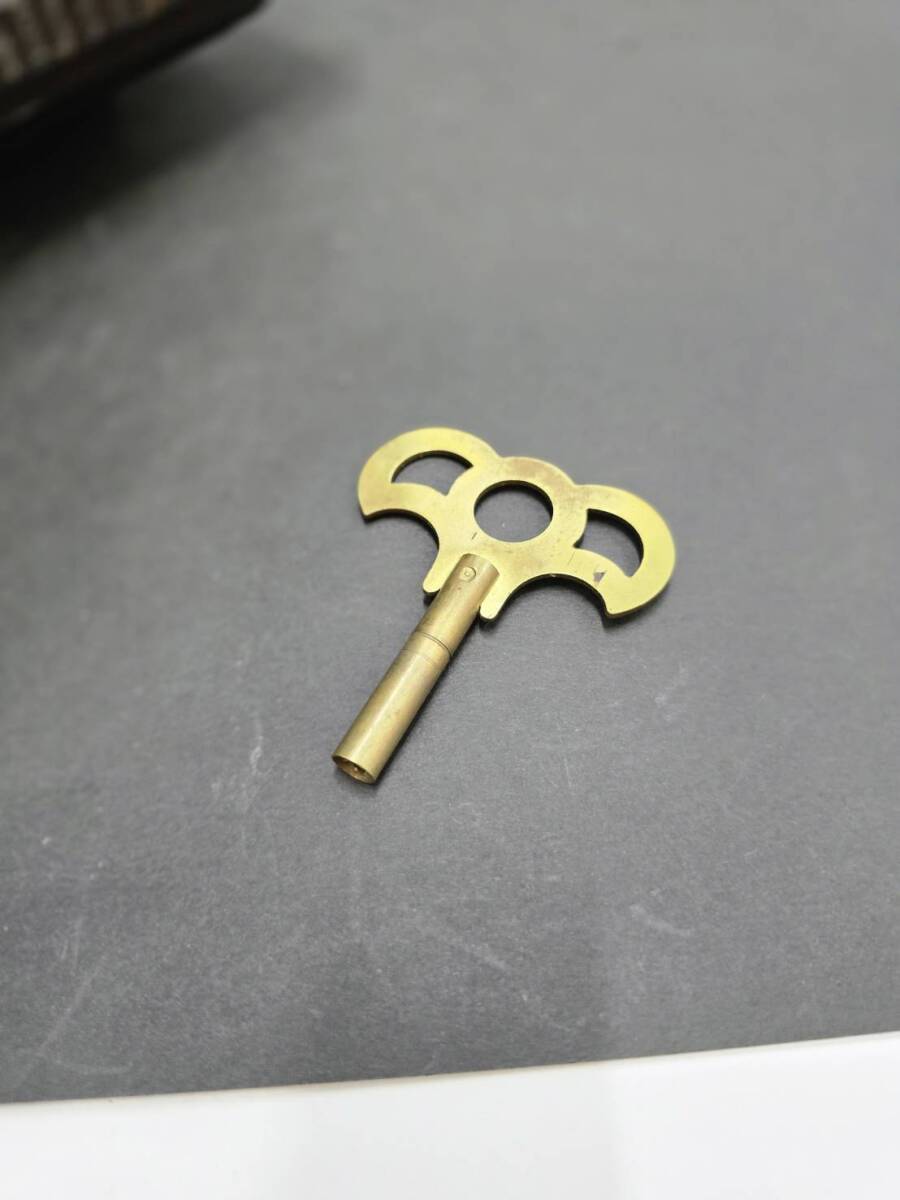 巻いて振り子を動かすと時計は進みます。分針が12時の所に来ると音が鳴りました。現状品でお願いします。