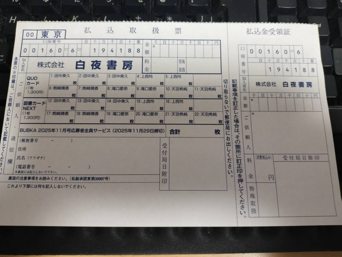 BUBKA11月号 クオカード 図書カード 払込取扱票1枚です。| 出价者 | 信用 | 价格 | 时间 |
