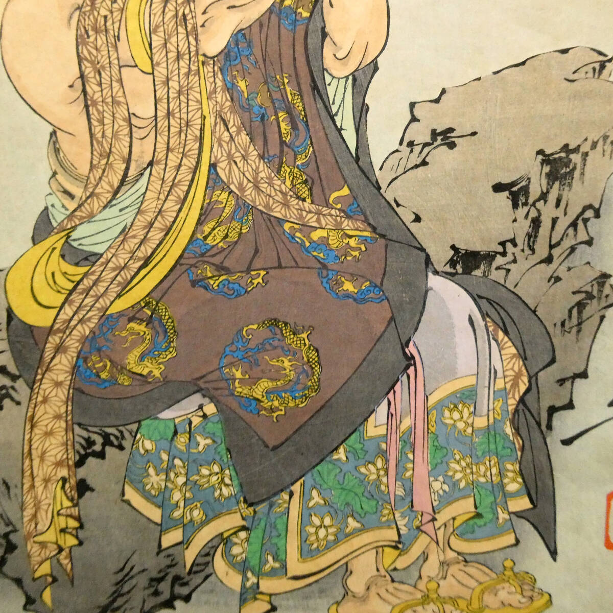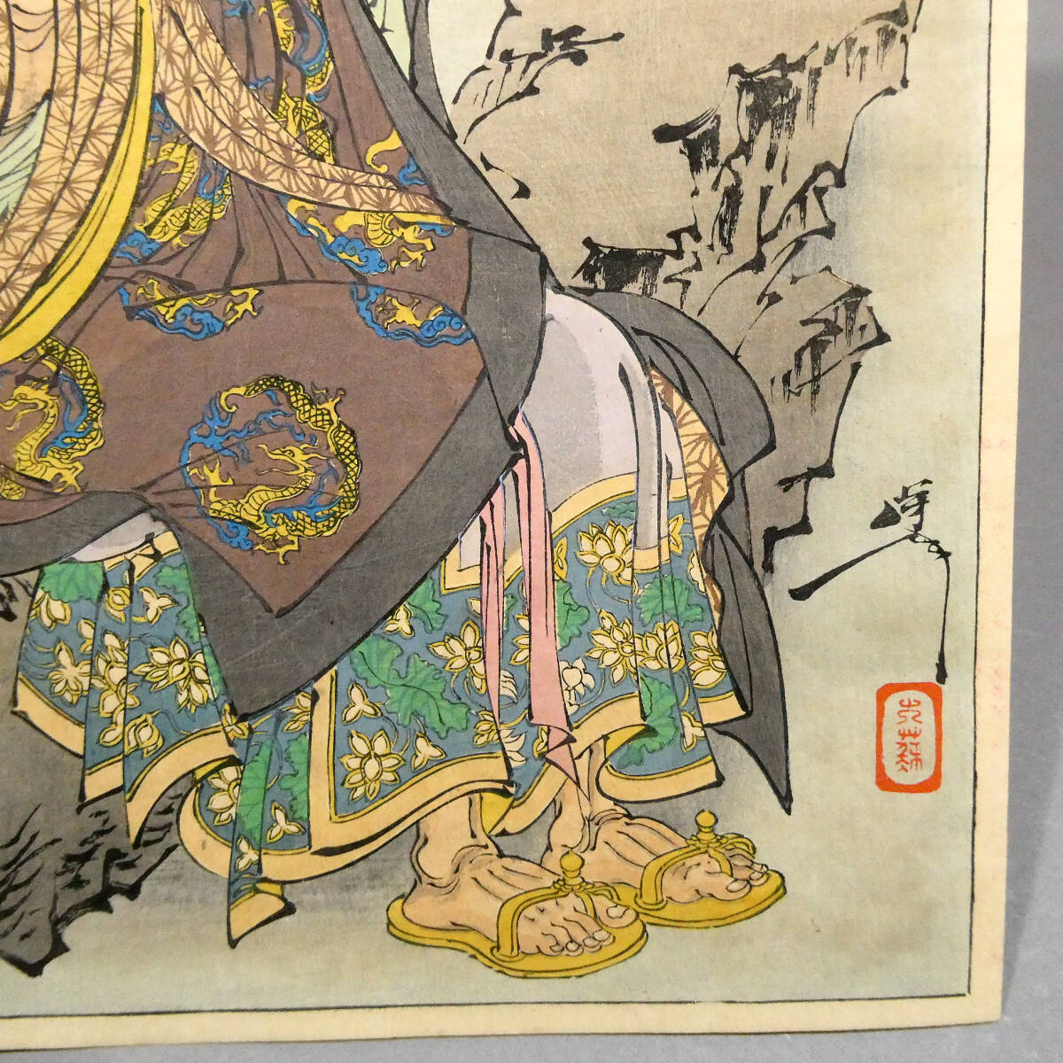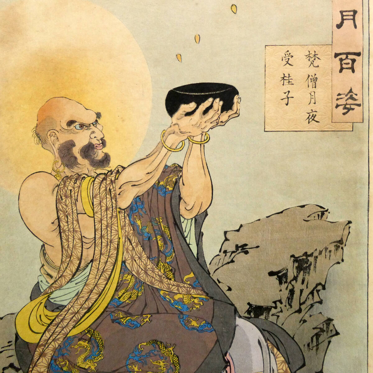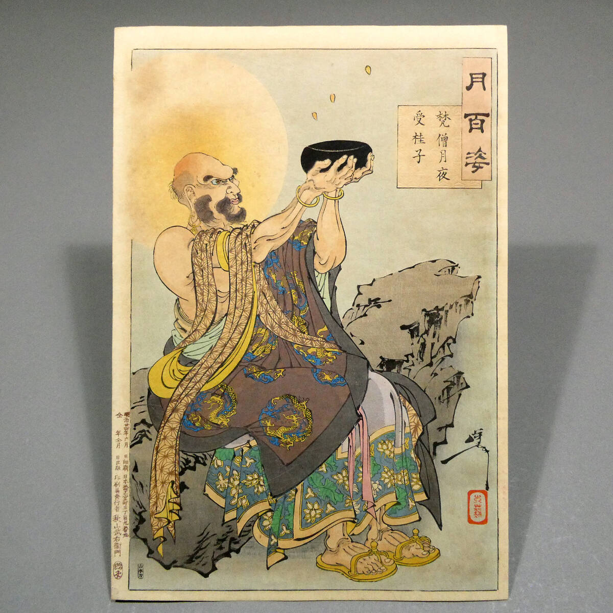 ■ 月岡芳年 明治24年 木板浮世絵 「月百姿 梵僧月夜受桂子」 阿羅漢 悟りを開く図 月夜に桂の実を受ける ■