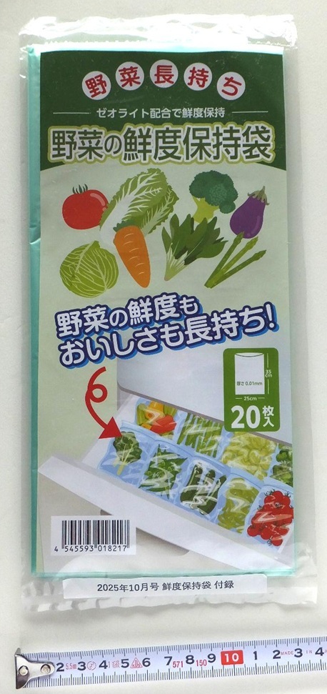 | 商品説明 | ゼオライト配合の野菜鮮度保持袋 20枚入 野菜長持ち 野菜の鮮度もおいしさも長持ち! サイズ 縦35cm 横25cm 厚さ0.01mm 薄い緑色 下部にシールで 「2025年10月号 鮮度保持袋 付録」と ありますが、いただきものの為詳細は不明です 家庭での保管品です。 気になる方は、入札ご遠慮ください。 整理番号 25282 |