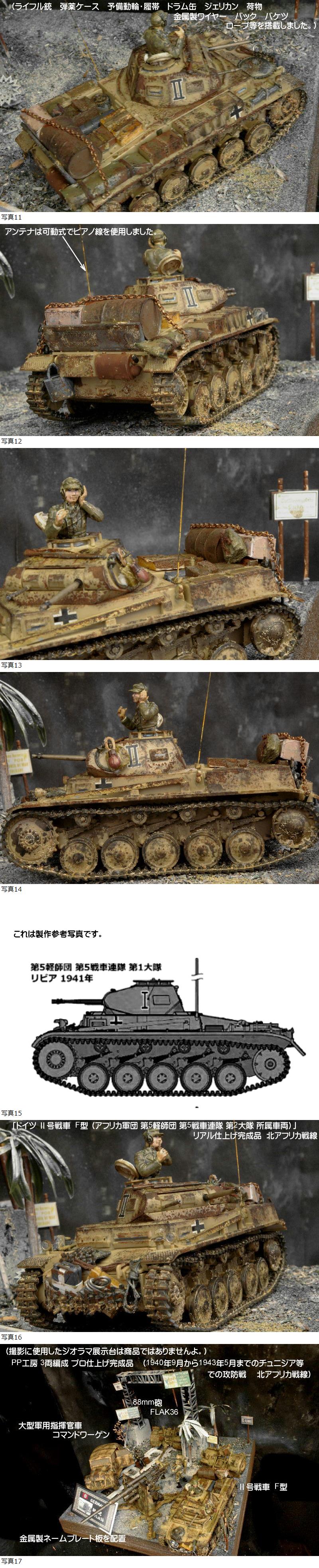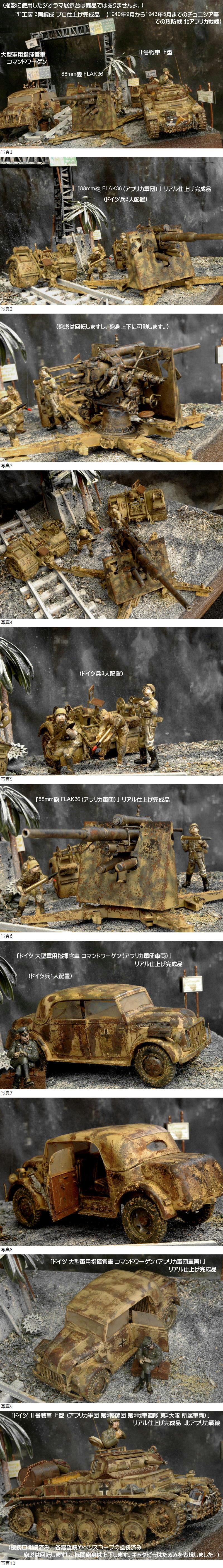 | ■今回の作品もジオラマではなく、3両編成完成品です。当店委託のプロモデラーが「ヘアスプレーチッピングや汚し塗装等」を施工するなどリアルに製作しており、クオリティは以下の商品説明の画像でも確認して下さいね。(撮影に使用したジオラマ展示台は、商品ではありませんよ。) ①1/35 「ドイツ 88mm砲 FLAK36(アフリカ軍団)」 リアル仕上げ完成品 ドイツ兵3人を配置しました。 ②1/35 「ドイツ 大型軍用指揮官車 コマンドワーゲン(アフリカ軍団車両)」 リアル仕上げ完成品 ドイツ兵1人を配置しました。 ③1/35 「ドイツ Ⅱ号戦車 F型 (アフリカ軍団 第5軽師団 第5戦車連隊 第2大隊 所属車両)」 リアル仕上げ完成品 北アフリカ戦線 (アンテナは可動式でピアノ線を使用しました。ライフル銃 弾薬ケース 予備動輪・履帯 ドラム缶 ジェリカン 荷物 金属製ワイヤー バック バケツ ロープ等を搭載しました。)戦車兵1人を搭乗させました。 ■ドイツの88ミリ砲は第二次大戦で最も成功した火砲と言われており、本来は高射砲として開発され、1940年のフランス戦線で初めて対戦車戦闘に使われ圧倒的な破壊力を証明しました。その後は北アフリカ戦線、東部戦線等の戦場に対戦車砲として登場し連合軍将兵を恐怖に陥れたのです。・・・「8.8 cm FlaK 18/36/37」 ■緻密で繊細に製作しており、とても精度の高い作品ですが、史実に忠実に表現したわけではありませんよ。(1940年9月から1943年5月までのチュニジア等での戦いを想定しました。 北アフリカ戦線) ■ヤフー画像検索で「PP工房完成品」と検索いただければ、当店の最近の作品の画像を見ることができますので、そちらも見ていただければ幸いです。・・・PP工房完成品 ★使用パーツなど(以下の作品がすべて付いてきますよ。) 1 1/35 タミヤ 88mm砲 FLAK36(砲塔は回転しますし、砲身上下に可動します。)ドイツ兵3人配置しました。 2 1/35 タミヤ 大型軍用指揮官車 コマンドワーゲン ドイツ兵1人を配置しました。 3 1/35 タミヤ Ⅱ号戦車 F型(機銃口開講済み 各潜望鏡やペリスコープの塗装済み 砲塔は回転しますし、機関砲身は上下します。キャタピラはたるみを表現しました。)ドイツ兵1人を配置しました。 4 金属製ネームプレート板「88mm砲 FLAK36」を配置しました。 ■当店(PP工房)では、プラモ完成品を週3回位の割合で出品しておりますので、よろしくおねがいしますね。 | |