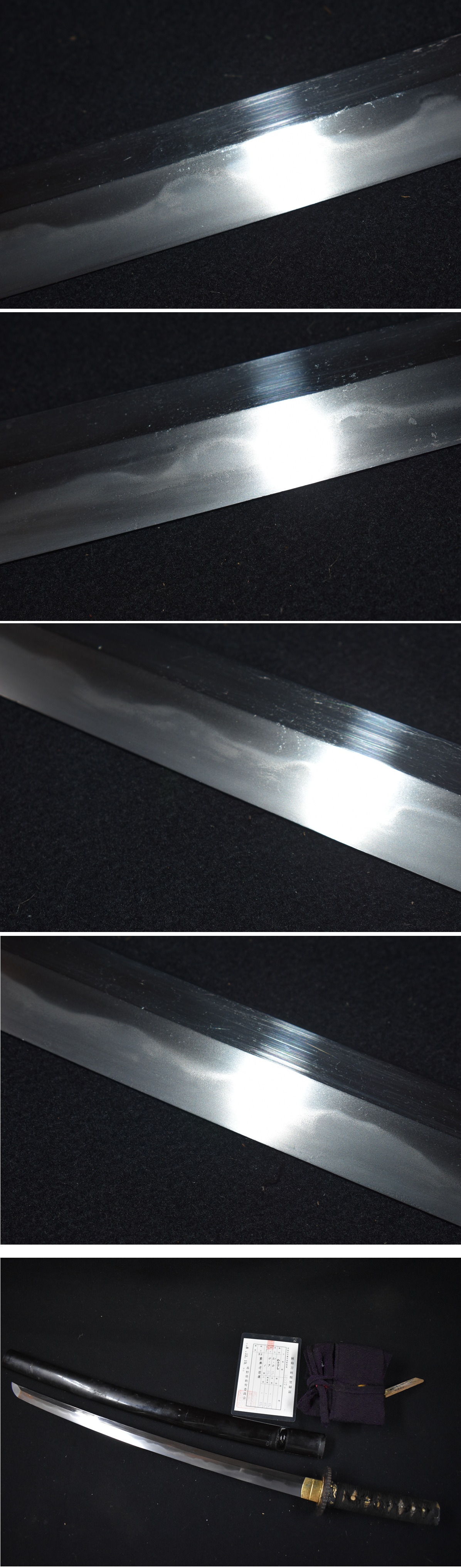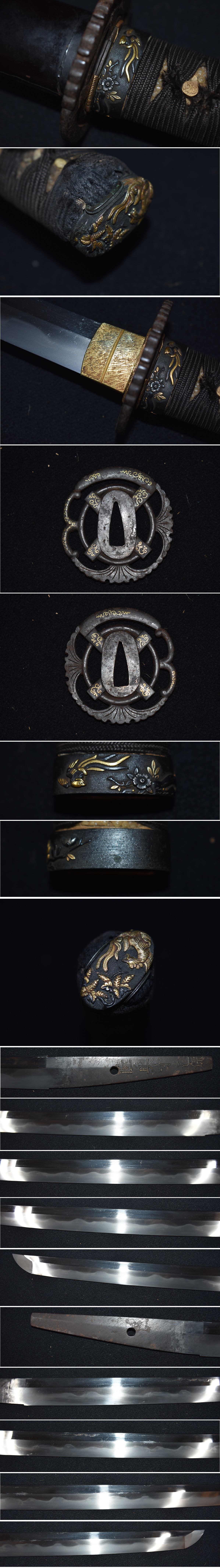 ご覧頂きありがとうございます。今回出品する品は写真の脇差です。 銃砲刀剣類登録証番号 長野 第81837号 種別 わきざし 長さ 51.0センチ 反り 0.9センチ 目くぎ穴 1個 元幅約2.9センチ 元重約0.7センチ 先幅約2.1センチ 在銘 陸奥守包保 二代目包保で、初代は左陸奥、二代は右陸奥です。左陸奥は鏡文字と言われる逆文字で切られている のに対し、右陸奥は普通に銘切りしてあります。 信州松本の水野家お抱え鍛冶で、人気があります。 拵え付きで、拵えもよく赤銅魚々子地の金象嵌縁頭で鉄地透かしの金象嵌鍔です。切羽もハバキも 金着せの高級品です。拵えは多少の痛みはありますが、高級拵えで見ごたえあります。 刀身は、大互の目乱れ刃紋の濤乱刃のような豪快な刃紋です。 出来は良く覇気のある刀身で、匂い口明るく見栄えのいい刀身です。多少の傷はありますが刃こぼれ やハギレはありません。 右陸奥の「陸奥守包保」人気刀工ですので、是非よろしくお願いします。 陸奥守包保は、左陸奥包保の門人で後に養子となりました。初銘の包重時代は銘を師の左陸奥と同じ く逆文字に切っていますが、包保と名を改めてからは通常の右文字に切っているので、師の「左陸奥」 と区別し、「右陸奥」と呼称されています。彼は後年に養父と共に信州松本城主水野家に抱えられ、 信州松本に於いても作刀しており、延宝五年から元禄二年までの年紀のある作品を残しています。 あとは写真と画像を見て判断してください。質問はわかる範囲でお答えしますので、入札前にお願い いたします。 発送はゆうパックの着払いです。 ※注意事項※落札しましたら、登録のある教育委員会に所有者変更届(名義変更)を出してください。 よろしくお願いいたします。 |