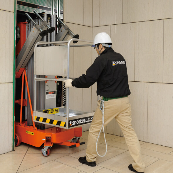 ※写真画像はULシリーズの代表イメージです。商品の詳しい仕様はメーカーカタログ等をご確認ください。| 商品名・型式 | 最大作業高 (m) | 最大床高 (m) | 最大積載荷重 (kg) | 作業床寸法(mm) | 保管時寸法(mm) | 重量 (kg) | 動力 | |||