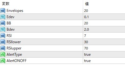 エンベロープ、ボリンジャーバンドの期間と偏差、RSIの期間と上限・下限をそれぞれ自由にご変更ください。