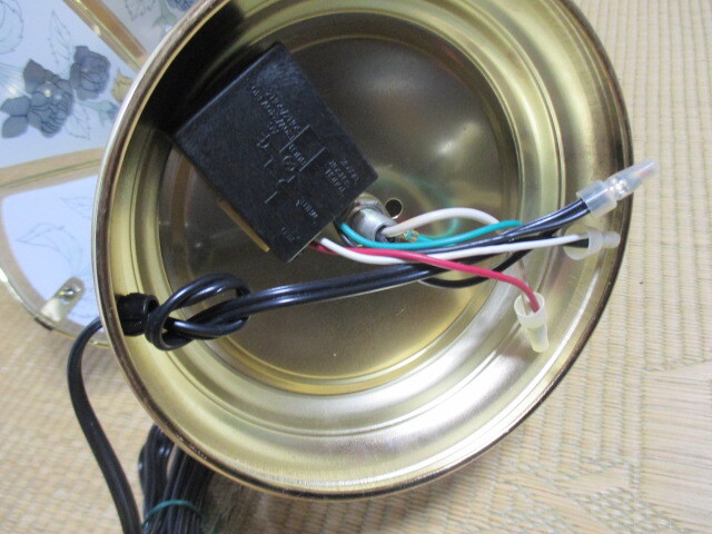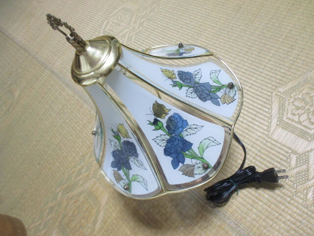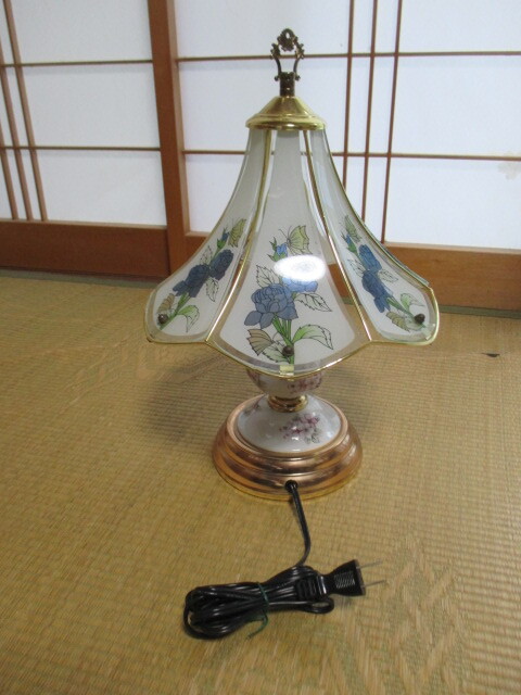 卓上ランプ傘の部分は花柄のガラス6枚で構成 台は金具と陶器でできています 電球は128V40Wです 点灯確認済 スイッチは金具に触れると3段階に切り替わります。コードは160センチノークレームノーリターン。 落札後初回連絡は48時間以内で商品受け取り後受取連絡お願いします