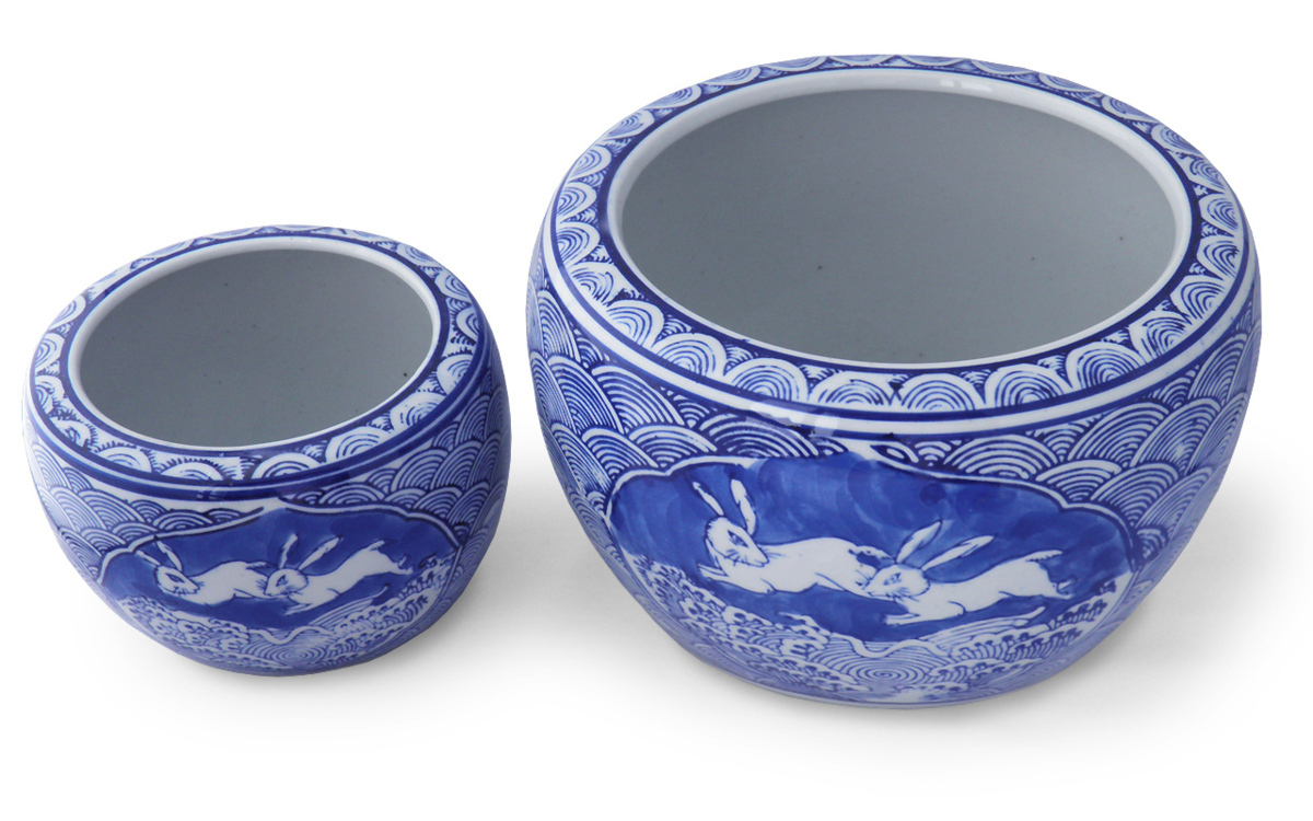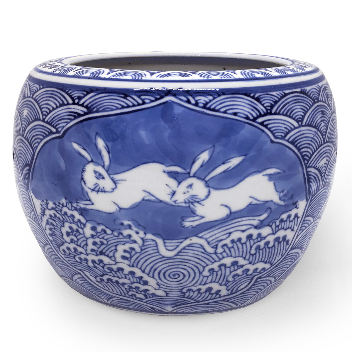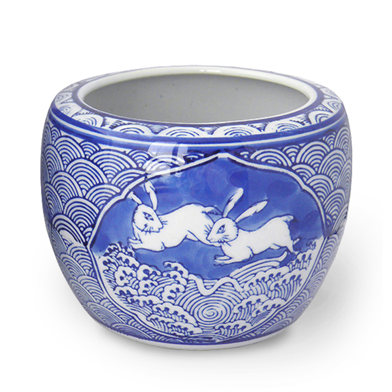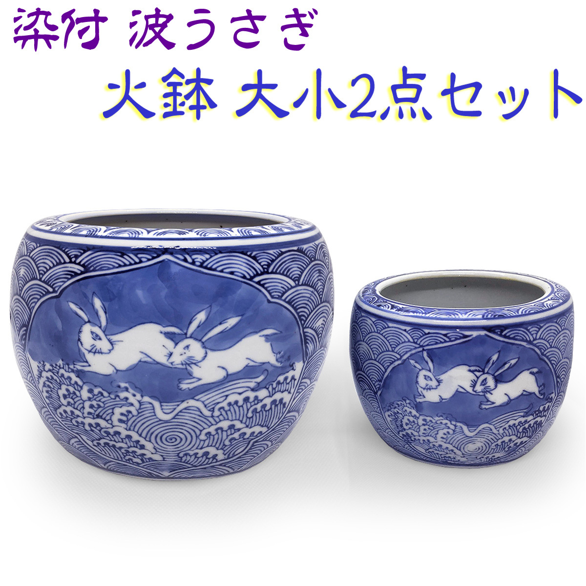 | 縁結びや良縁の縁起物として有名なウサギのモチーフ。 古来よりウサギの絵柄は「飛び跳ねる=飛躍」から出世運や財運を呼ぶと言われ、「子沢山=豊穣」から安産祈願や子宝運を招くとして珍重されてきました。 波間を跳ねる二羽のウサギが印象的なこちらの火鉢は大小2点組、アイディア次第で様々な用途にお使いいただけます。 ▼サイズ 大:最大直径20.5cm、開口部14.5cm、高さ14.5cm 小:最大直径14cm、開口部10cm、高さ10.5cm ※品ごとに若干の違いあり。 ▼素材・仕様 染付け陶器、大小2点組、オリジナル説明書付き ※商品本体以外の品は撮影用の小道具で、出品物には含まれません。 ▼商品の特性 昔ながらの手法を活かした品です。 釉ムラ、印判ズレ、滲み、カスレ、黒ポチ、ピンホールやブクといった焼成時に発生する窯傷等のある場合がございます。 素朴な手作り品ならではの味わい・特性としてご理解いただけますよう、お願い申し上げます。 ▼取り扱い上のご注意 火鉢としてお使いの際は、灰や五徳など別途ご用意ください(当店では扱っておりません)。 室内で炭をお使いになる際は換気に注意し、火の始末にはくれぐれもご注意願います。 ワインや冷酒のクーラーとしてご利用の際、鉢と酒瓶が強くぶつかりあうと破損の恐れがございますので、ご注意ください。 |
