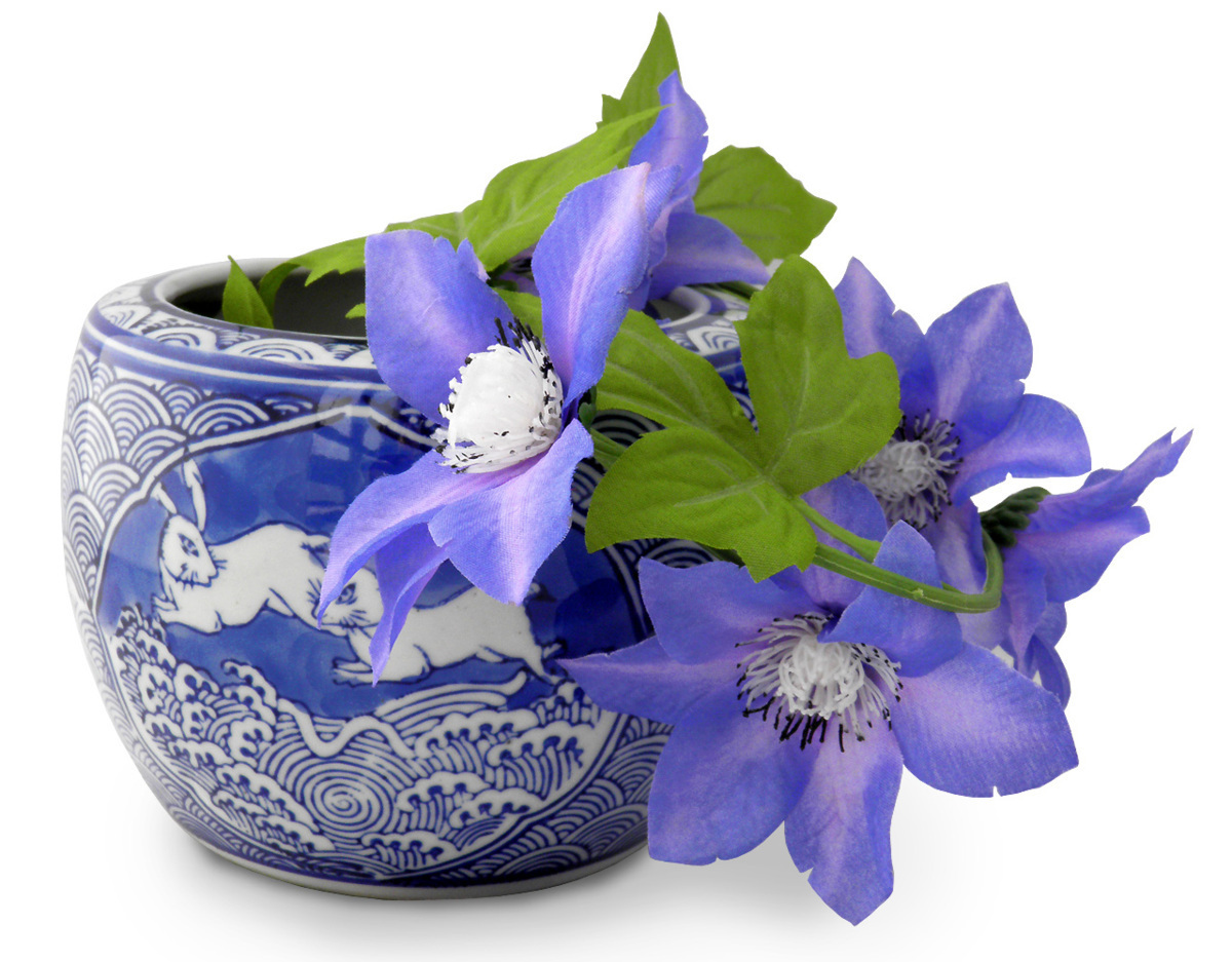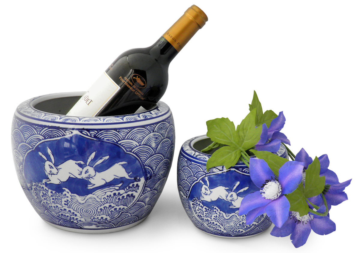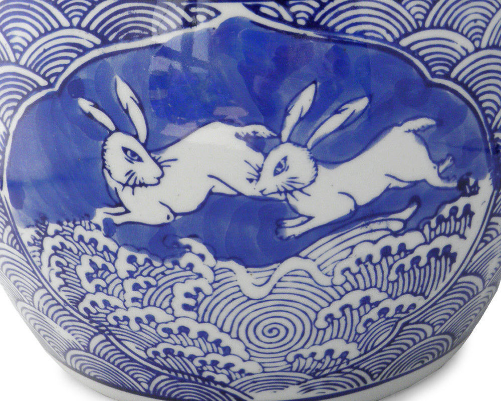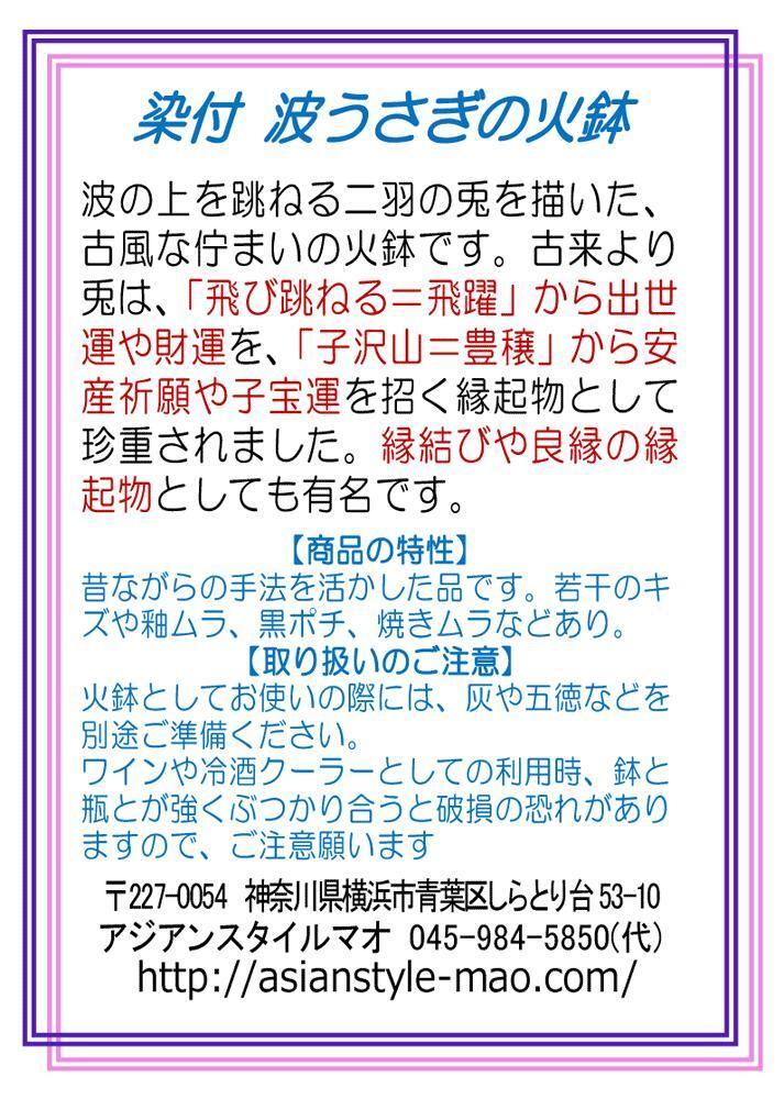| 縁結びや良縁の縁起物として有名なウサギのモチーフ。 古来よりウサギの絵柄は「飛び跳ねる=飛躍」から出世運や財運を呼ぶと言われ、「子沢山=豊穣」から安産祈願や子宝運を招くとして珍重されてきました。 波間を跳ねる二羽のウサギが印象的なこちらの火鉢は大小2点組、アイディア次第で様々な用途にお使いいただけます。 ▼サイズ 大:最大直径20.5cm、開口部14.5cm、高さ14.5cm 小:最大直径14cm、開口部10cm、高さ10.5cm ※品ごとに若干の違いあり。 ▼素材・仕様 染付け陶器、大小2点組、オリジナル説明書付き ※商品本体以外の品は撮影用の小道具で、出品物には含まれません。 ▼商品の特性 昔ながらの手法を活かした品です。 釉ムラ、印判ズレ、滲み、カスレ、黒ポチ、ピンホールやブクといった焼成時に発生する窯傷等のある場合がございます。 素朴な手作り品ならではの味わい・特性としてご理解いただけますよう、お願い申し上げます。 ▼取り扱い上のご注意 火鉢としてお使いの際は、灰や五徳など別途ご用意ください(当店では扱っておりません)。 室内で炭をお使いになる際は換気に注意し、火の始末にはくれぐれもご注意願います。 ワインや冷酒のクーラーとしてご利用の際、鉢と酒瓶が強くぶつかりあうと破損の恐れがございますので、ご注意ください。 |