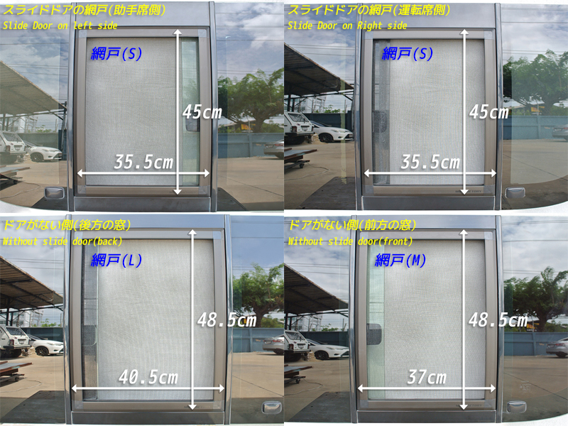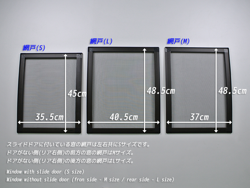 | 【網戸サイズの違い】 スライドドアについている窓の網戸サイズはSです。(縦45cm×横35.5cm) スライドドアではない前方側窓の網戸サイズはMです。(縦48.5cm×横37cm) スライドドアではない後方側窓の網戸サイズはLです。(縦48.5cm×横40.5cm) 網張替えキット近日発売 |