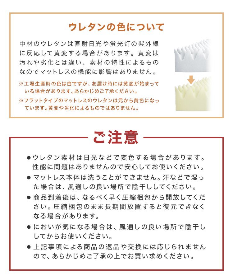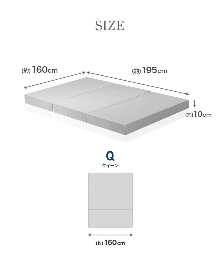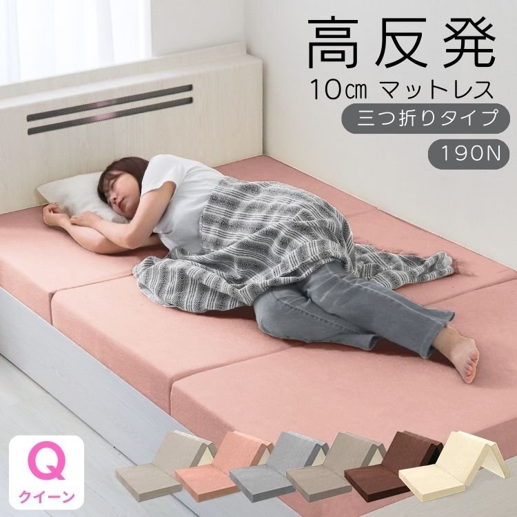 収納しやすい三つ折りタイプ! 腰をやさしく支える高反発マットレスです。 厚みたっぷり10cmで、1枚でも底付き感のない寝心地。 高反発マットレスは下からの跳ね返りの力により、沈み込みが少ないのが特徴です。 その為、寝返りがうちやすく就寝時の身体の一部分(首・肩・腰・足)にかかる体圧も分散。 寝返りが多い方や仰向けに寝ることが多い方にオススメです。 三つ折りタイプは、押入れなどに収納しやすく、立て掛けておいても場所をとりません。 カバーは1枚タイプの高反発マットレス同様に、取り外して洗濯することができます。 【商品仕様】 カラー:アッシュピンク タイプ:フラットタイプ 生地:パイル サイズ(約):幅160cm×長さ195cm×厚み10cm(クイーンサイズ) 素材:マットレス本体:高反発ウレタン/カバー:ポリエステル100% 生産国:中国 【注意事項】 ・圧縮梱包されたままの状態で長期間保管した場合、マットレスが復元できなくなってしまいます。 商品到着後、1週間以内に 必ず圧縮から開放をして頂くようにお願いいたします。 ・マットレスは約1-2日で復元します。気温や温度により3-14日かかる場合もあります。 ・製品の臭いが気になりましたら、風通しの良いところで脱臭してください。 この臭いは素材のウレタンによるもので無害です。 臭いに敏感な方は十分ご検討の上、ご購入をお願いいたします。 ・マットの硬さは温度によって変わってきます。また、硬さの感じ方には個人差があります。 ・カバーは取り外して洗濯ができますが、マットレス本体は洗濯しないでください。 ・生産ロットによって復元率・ニュートンに差異が生じる場合があります。 ・商品は、モニターによって色合いが異なって見える場合があります。 ・仕様・デザインは改良のため予告なく変更することがあります。 |
