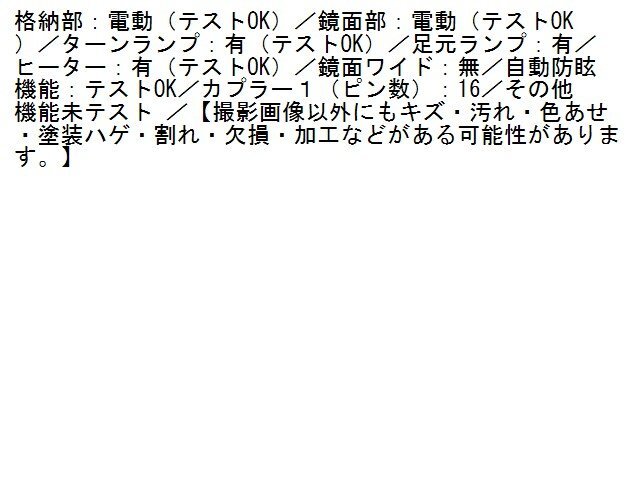 | 商品情報 | 格納部:電動(テストOK)/鏡面部:電動(テストOK)/ターンランプ:有(テストOK)/足元ランプ:有/ヒーター:有(テストOK)/鏡面ワイド:無/自動防眩機能:テストOK/カプラー1(ピン数):16/その他機能未テスト /【撮影画像以外にもキズ・汚れ・色あせ・塗装ハゲ・割れ・欠損・加工などがある可能性があります。】 | ||