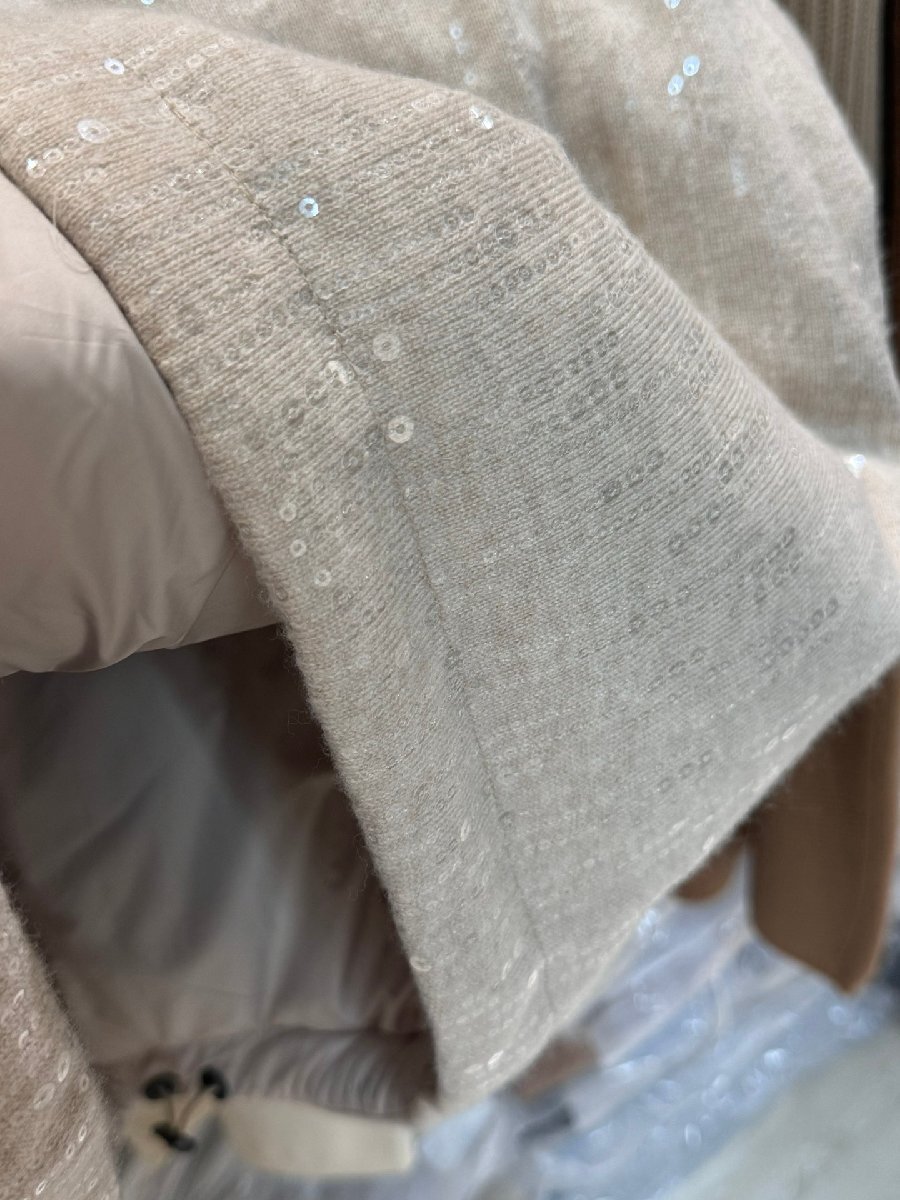 贅沢なカシミヤニットとダウンの組み合わせが魅力的なショート丈ジャケットです。全体に散りばめられたスパンコールが上品な輝きを放ち、特別な存在感を演出します。ホワイト、ベージュ、ダークグレーの3色展開で、それぞれに異なる魅力があります。軽量で暖かいグースダウンを使用し、カシミヤニットの柔らかな肌触りと相まって、極上の着心地を実現しています。フロントジッパー仕様で着脱が簡単です。スタイリッシュなシルエットながら、ゆったりとした着用感で体型を選びません。光沢のあるスパンコールデザインは、カジュアルからドレッシーなコーディネートまで幅広く活躍します。寒い季節のワードローブに、華やかさと実用性を兼ね備えた一着として、大切に着用いただけます。| 出价者 | 信用 | 价格 | 时间 |