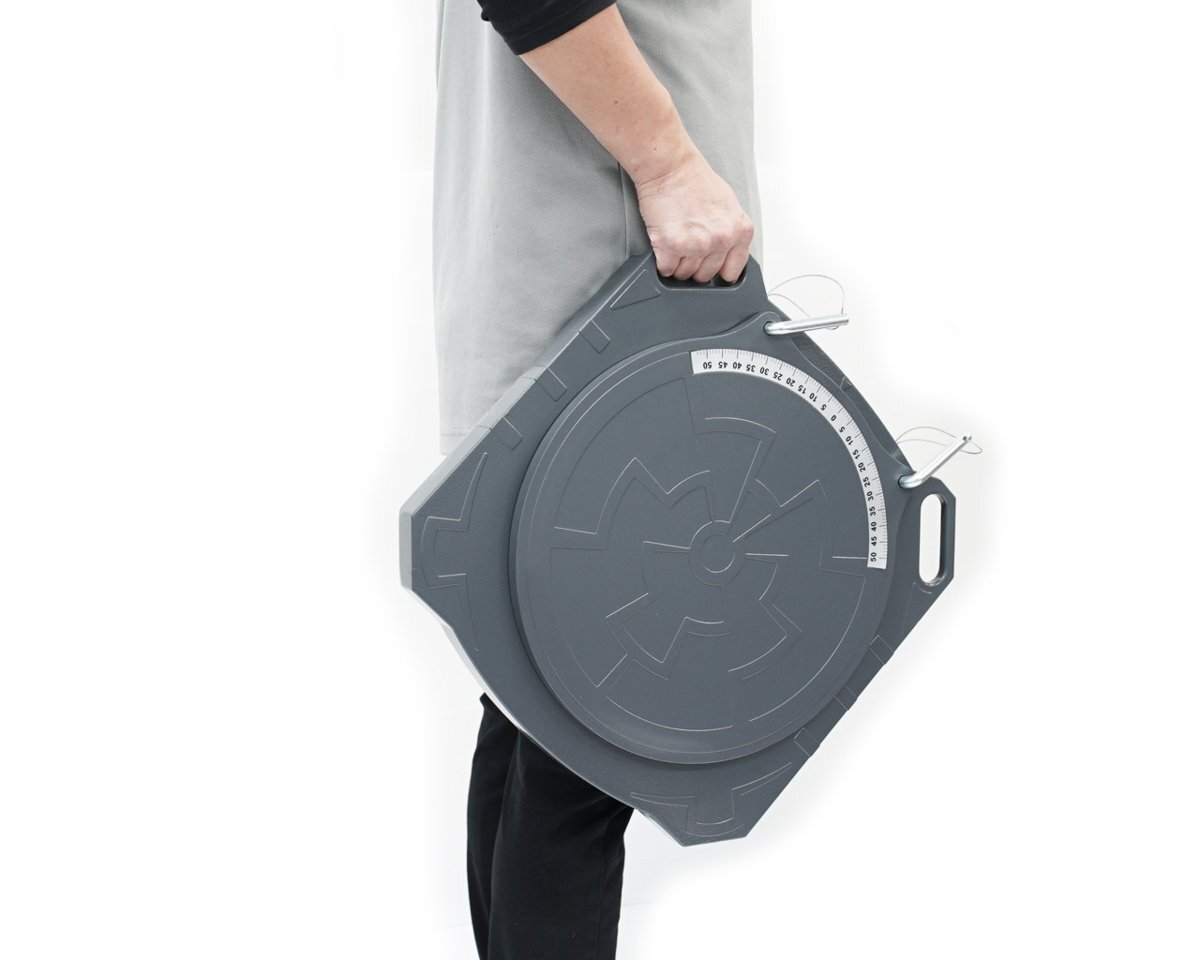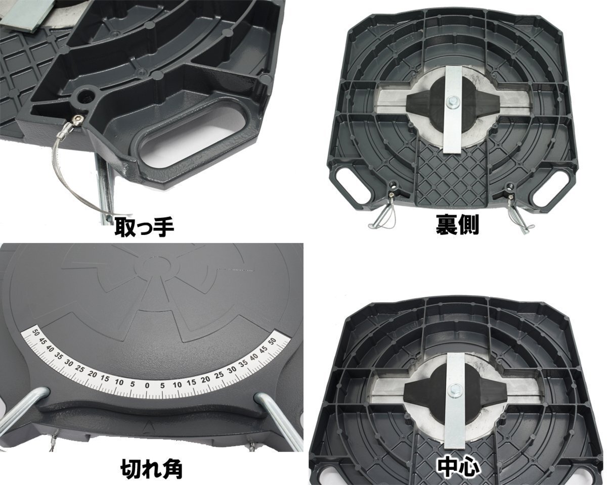 | 仕様 | 製品サイズ:395mm×385mm×46mm ターンテーブル径:335mm 耐荷重:2台で約2000kg 材質: 本体:アルミ、部品類:スチール 本体重量:5.5kg(1台) 切れ角:50度 |
