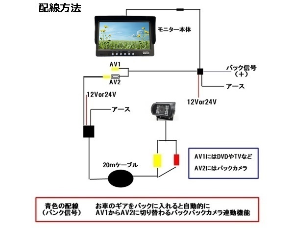 | 迅速・丁寧に出来る限りお客様に商品を早くお手元に届くように進めていきます。 どうぞ宜しくお願い致します。 ☆商品特徴☆ これ一台で、ギッシリ駐車場も楽々!!!バックオーライ!! もちろん、自動赤外線切り替え付のカメラなので非常に見づらい夜間でも良く見えます。 皆様、入札宜しくお願い致します。 ☆モニター商品詳細☆ ・7.0インチオンダッシュモニター ・16:9、4:3の2パターン切り替え可能 ・カラー:NTSC&PAL(両対応自動切換え) ・解像度:800×480 ・液晶パネル :TFT-LCD (日本製) ・液晶調整:カラー調整、ブライト調整、コントラスト調整、Tint調整 ・サイズ: 170mm(W)×113mm(H)×20mm(D) ・電源:DC24V/DC12V ・色:ブラック ・付属品:7.0インチモニター本体、スタンド、ケーブル、リモコン、説明書 *リバース連動機能:モニター付属品のケーブルの青線をリバース検出(バックランプなど24Vあるいは12Vの発生する場所) に繋ぎ込むとリバースに入れると自動で、AV2に切り替わるシステムです。(バックカメラなどを付けるときに非常に便利な機能です。) ☆バックカメラ商品詳細☆ ・赤外線付き ・画素数:628XRGBX582=365496 ・画像:NTSC ・電源:DC24V/DC12V ・カメラ:防水機能付き ・サイズ:75(W)×50(H)×75(D)ミリ *電源ケーブルとビデオケーブルが、一緒になっているので、カメラ本体とケーブルを繋げるだけで余分に電源ケーブルを取り付ける手間が省けるので、楽々取り付け出来ます。 *36万画素高画質自動赤外線切り替え装置付カラー映像バックカメラ赤外線カメラは、映像が良く見える最新型です。 *カメラ付属品:赤外線カメラ、20m電源映像延長ケーブル、ネジ ☆取り付け注意事項☆ ・お取り付けの電気ショートは、十分に注意お願い致します。 ・此方の商品は、DC24Vです。(DC12Vでも使用可能) ・機器破損の原因になりますので、分解はしないでください。 (分解による機器破損及び商品の改造・加工は、交換対象外になります。) |