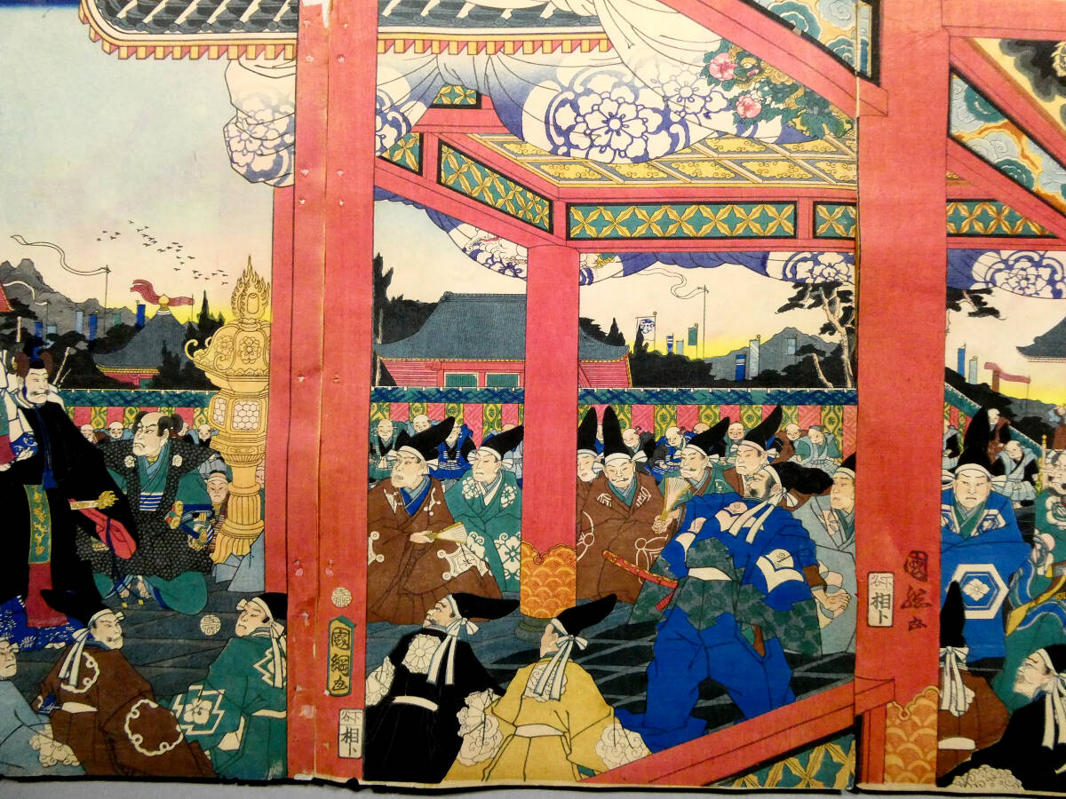 ■ 歌川国綱 江戸時代 木版浮世絵 「大伽藍法要之図」3枚続揃い 信長の葬儀 秀吉、織田家後継の三法師を擁す ■