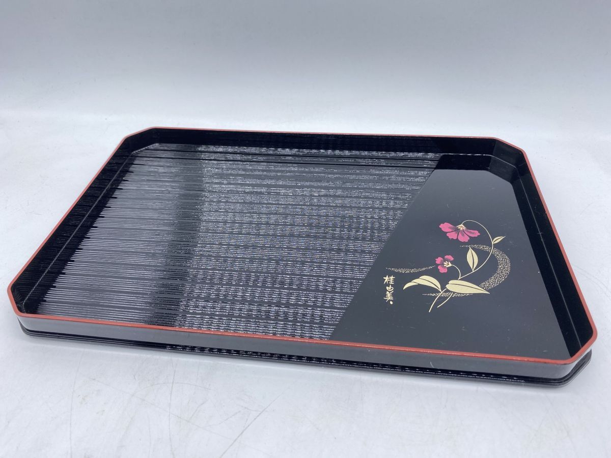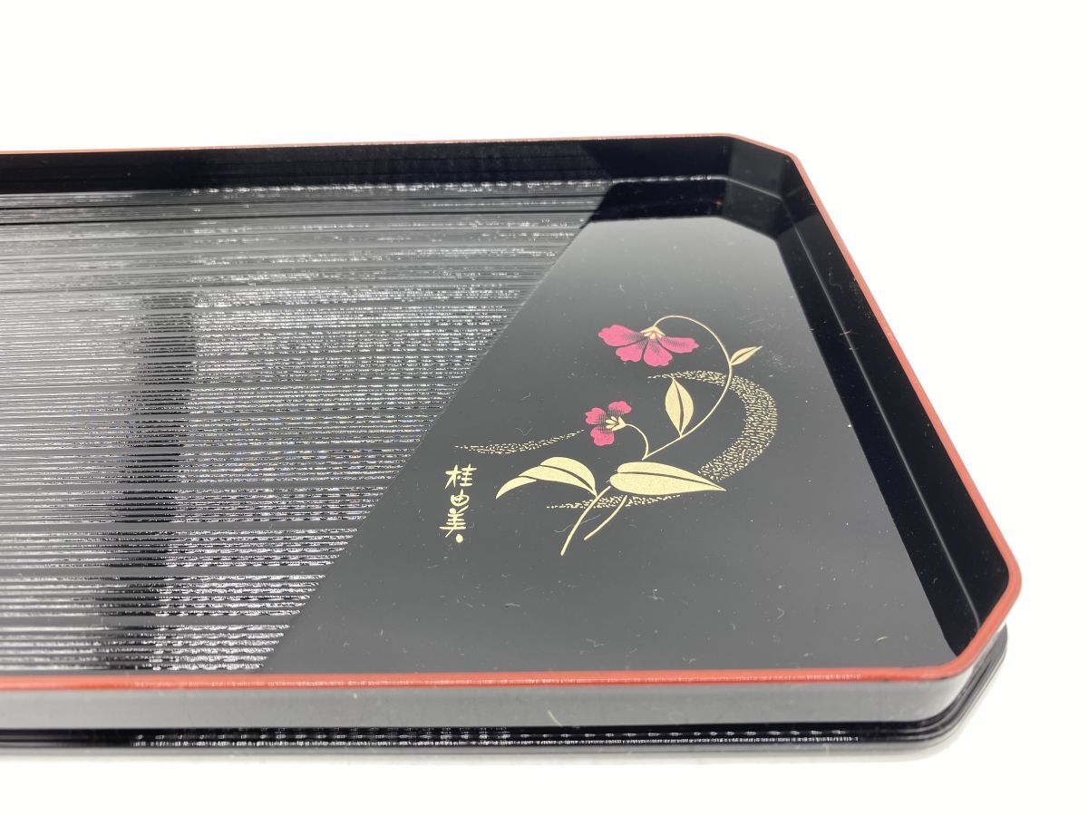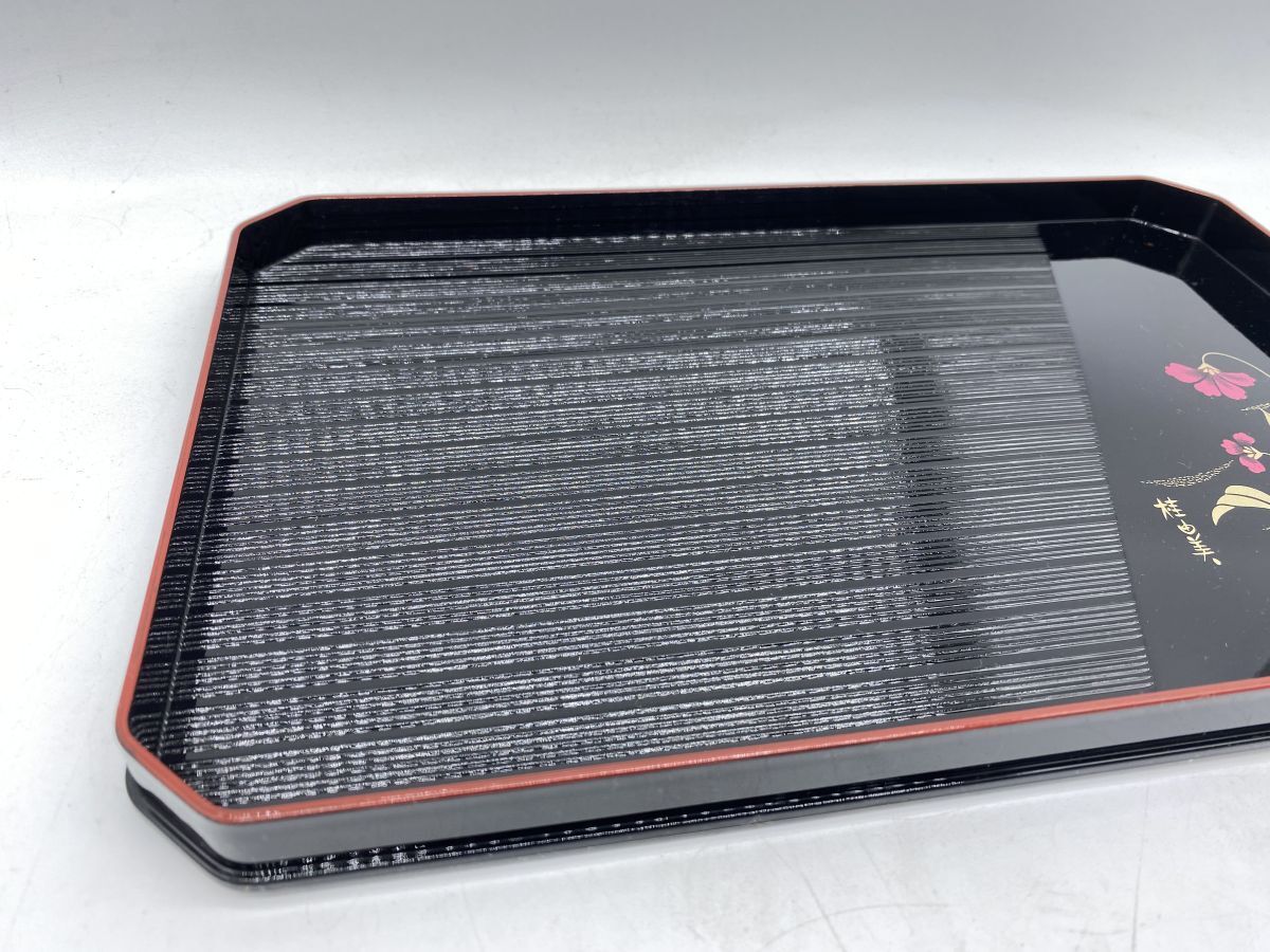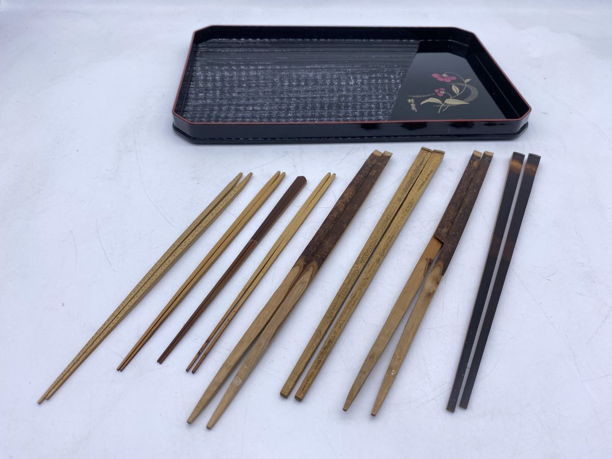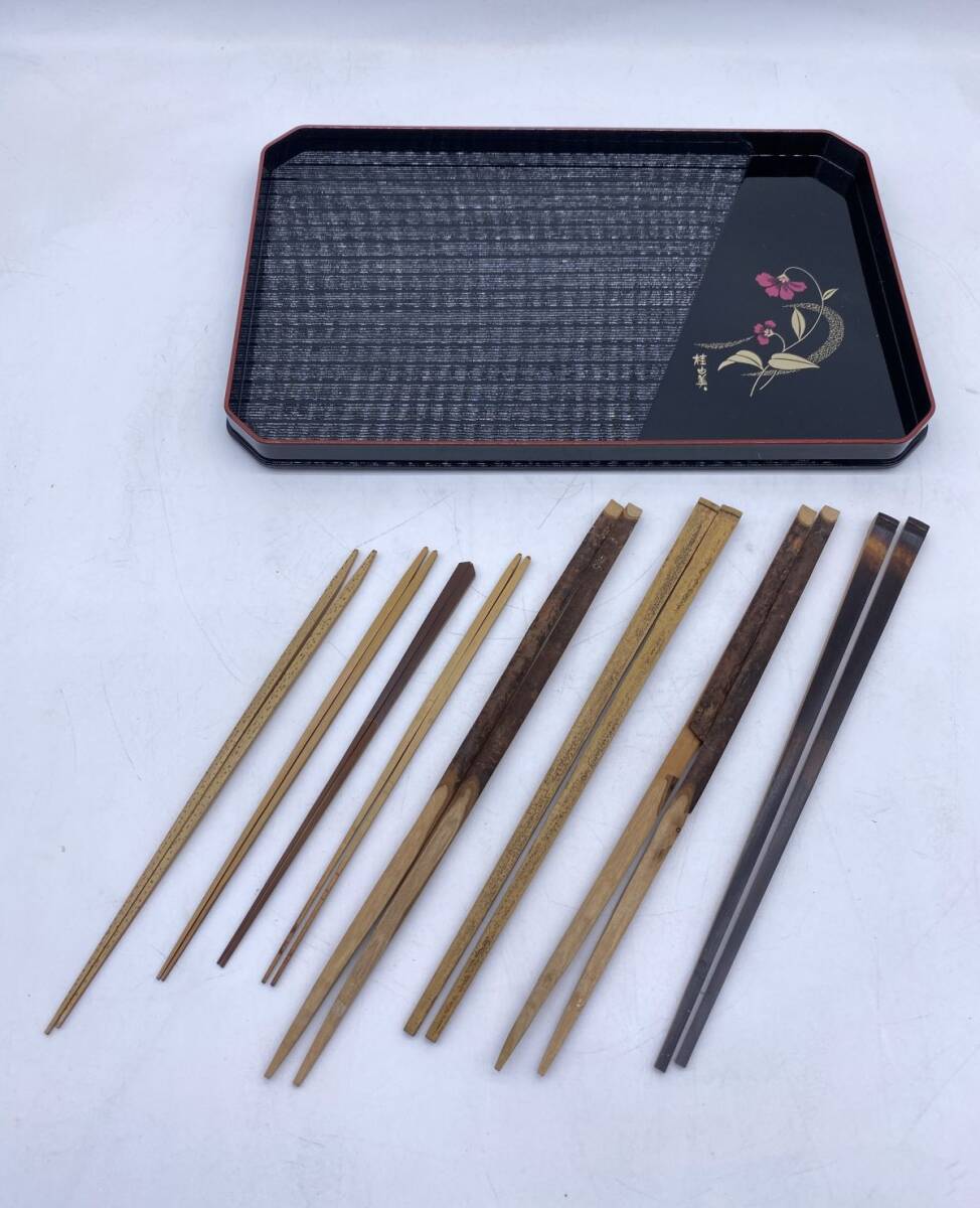 | 「もっと見る」へ画像追加★商品説明★ | 大きさ(約) 盆 30x 19x 2cm 重さ(約) 盆 167g 箸まとめ 59g 箸に一部剥がれがございます。 その他古いものですので、スレ、ヤケ等ございます。 画像にてご確認ください。 |