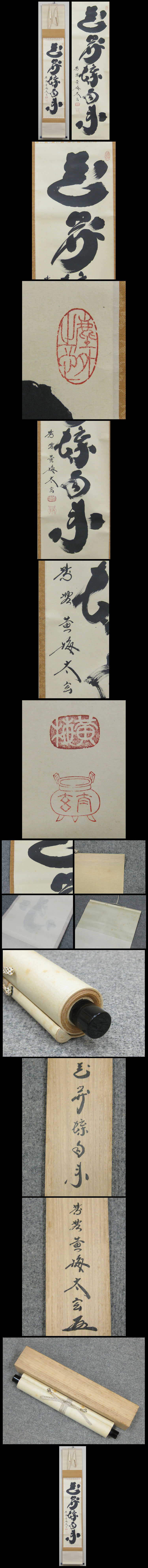 【小林太玄】(太玄義透) 昭和13年奉天(今の瀋陽)生。兵庫県の赤穂育ち。 昭和50年大徳寺塔頭黄梅院住職に就任。 豪快な書体は人気が高い。 ★商品サイズ★ ■掛軸 181×30.5cm ■作品 102×28cm ★商品の状態★ 作品・表具共にわずかな点しみがあります。 裏側上部に時代のしみ汚れ、本紙裏にわずかな点しみがあります。 ご承知のうえご入札をお願いします。 時代など詳しくは画像にてよく確認のうえでご検討いただければと思います。 どうぞよろしくお願いいたします。 |