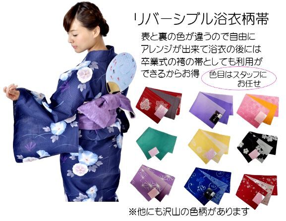 | 【下駄】 桐下駄や塗り下駄を追加できます 桐下駄でとても軽く鼻緒が柔らかく 鼻緒づれしにくい下駄になっています。 【浴衣帯】 リバーシブルの帯で浴衣の帯に合わせることが 出来ます。練習すればたくさんの結び方ができます。 袷帯 袷の帯になっている為、浴衣だけでなく小紋や無地の お着物にも使えます。 リバーシブルにもなっており両面使うことが出来ます。 【蝶帯】 帯が結べない方でも安心して着用頂けます。 腰に巻き付け後ろの結びの部分は形になっているので 後は差し込むだけの帯です。 【小物セット】 浴衣着用に必要な小物が全て揃っています。 |