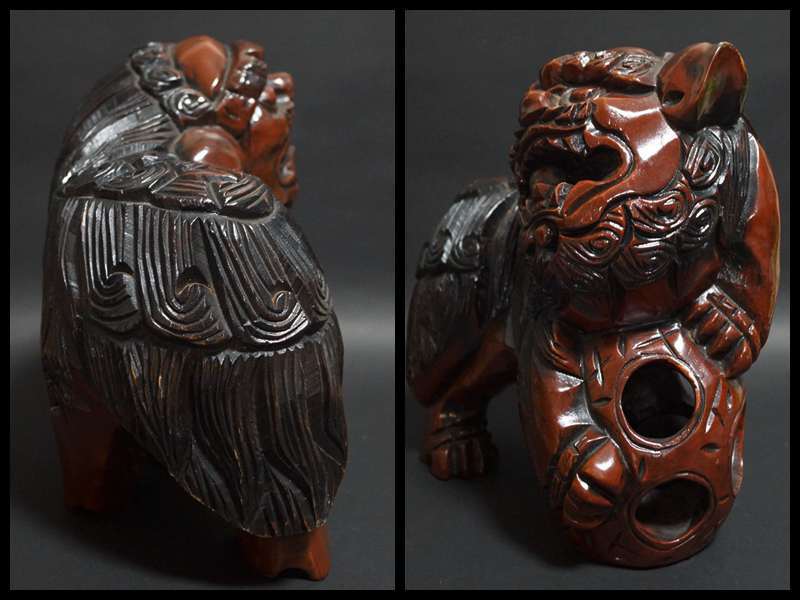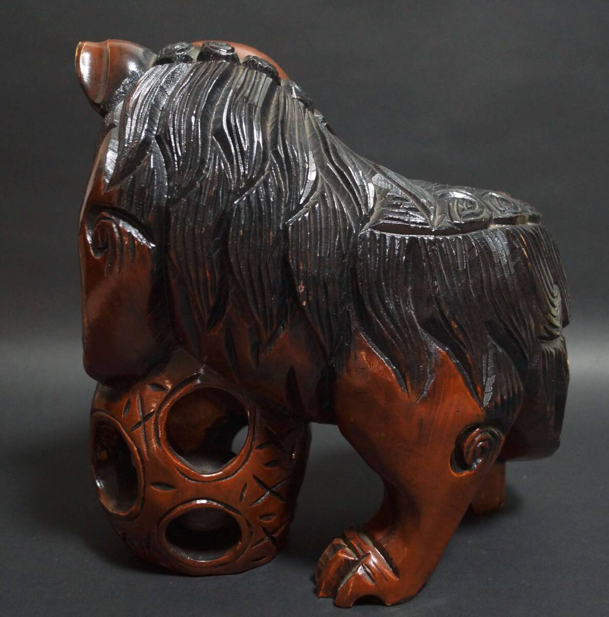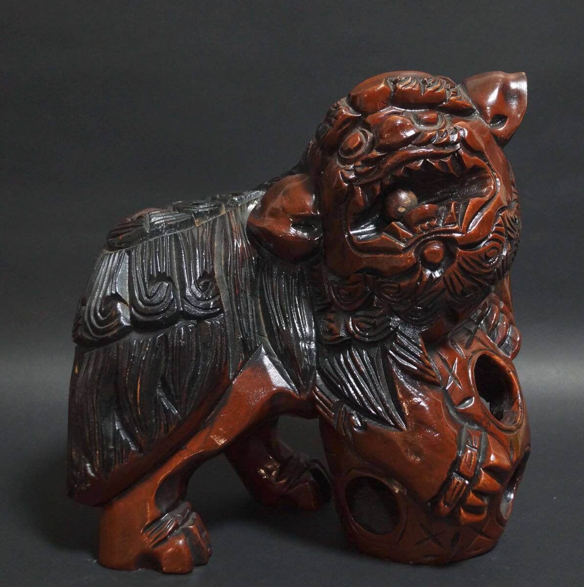 木製細工彫り玉乗り獅子 狛犬シーサー置物 漆塗り 開運 魔除け 縁起物 レトロ 高さ24.5cm★時代物★ サイズ(約): 横幅22.5cm、奥行13cm、高さ24.5cm、重さ2.1㎏ |