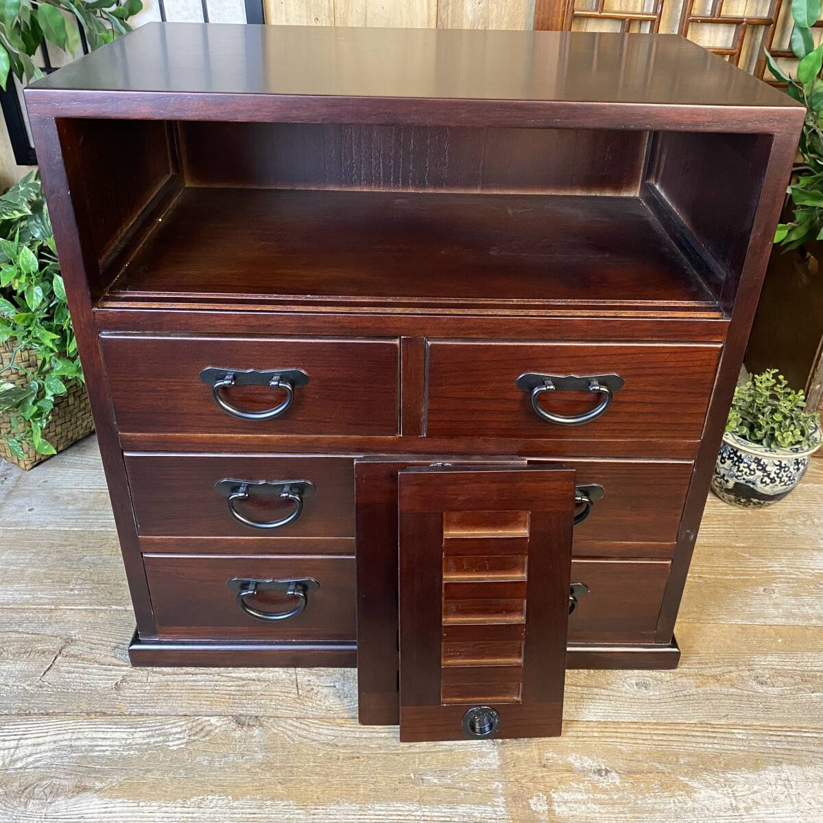 ◆◇商品詳細◇◆ 民芸家具多引き出しタンス 民芸調和多引き出しタンスチェストです。古き良き和の心、深みのあるお色が素敵な品です!お部屋のインテリアやショップのディスプレイ、和室にも合わせやすいですよ!小ぶりなタンスですが、引き出しが多く、小物をたくさん収納できます。アパート小部屋、施設ルーム、寮部屋などに最適なサイズ感です。和室や、アジアンテイストインテリアに良く合うお品です。天板が広く、飾り台やテレビ台などにもアレンジできそうですね! 【商品状態説明】 小キズあり、まずまずの美品。 完成品になります。 ※こちらの商品は、現品画像ではありません。製造段階や輸入段階での小キズ等で検品落ちしたB級アウトレット品の中から順番に発送しております。ほとんど気にならない程度の小キズになり、使用には全く問題はございませんが、気になる場合はご遠慮ください。他に『美品』記載の商品がありますのでそちらをご検討ください。 【サイズ】 横幅:56cm(下部土台含む横幅:58㎝) 奥行:34cm 高さ:58cm 引出し内寸大49cm×29cm×8cm 引出し内寸小22.5cm×29cm×8cm 引き戸扉内寸52cm×29cm×14cm 【素材】 木製桐材無垢 【カラー】 ブラウン 【完品参考価格】 ¥19.800 | ◆◇発送方法◇◆ ●送料は基本無料ですが、沖縄・離島などにお住まいの方はご負担ください。 (沖縄・離島の方はメールにてご連絡いただければ、送料をお知らせいたします。) ●ヤマト運輸・佐川急便・第一貨物のいずれかにて配送いたします。 (運送会社の指定はできません。ご了承ください。) ●日時・時間指定のある方や、お問い合わせ(追跡)番号をご希望の方は取引連絡の際にお知らせください。 | |