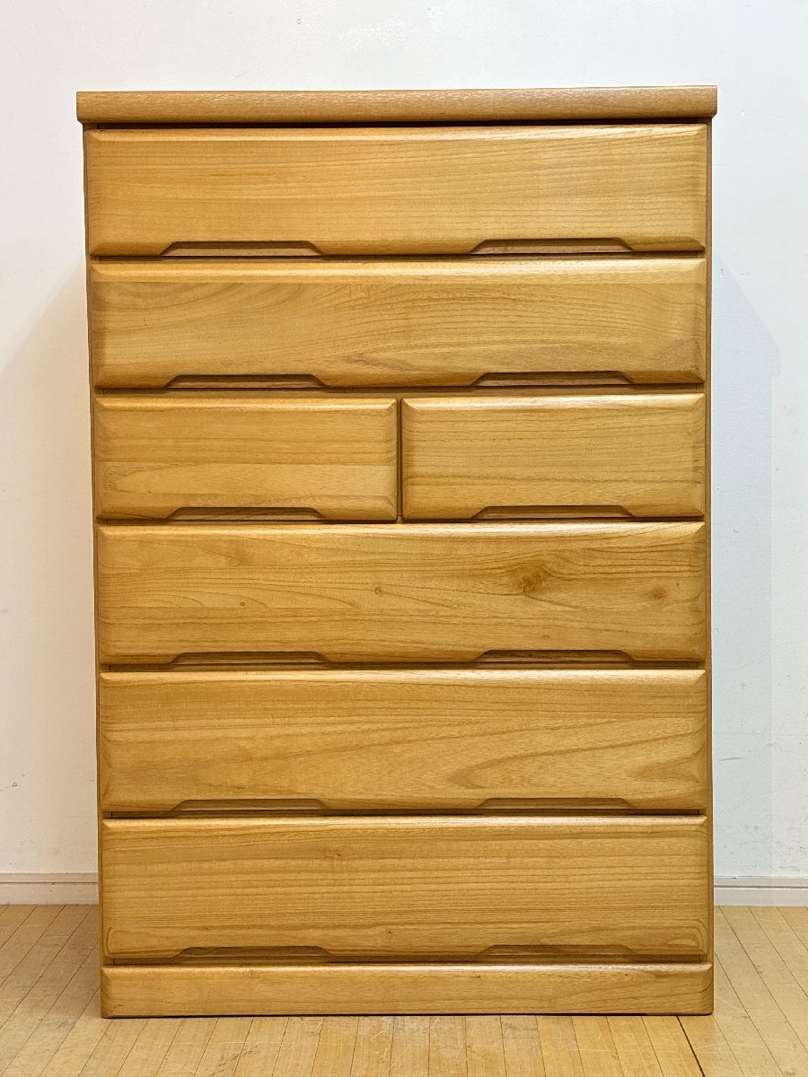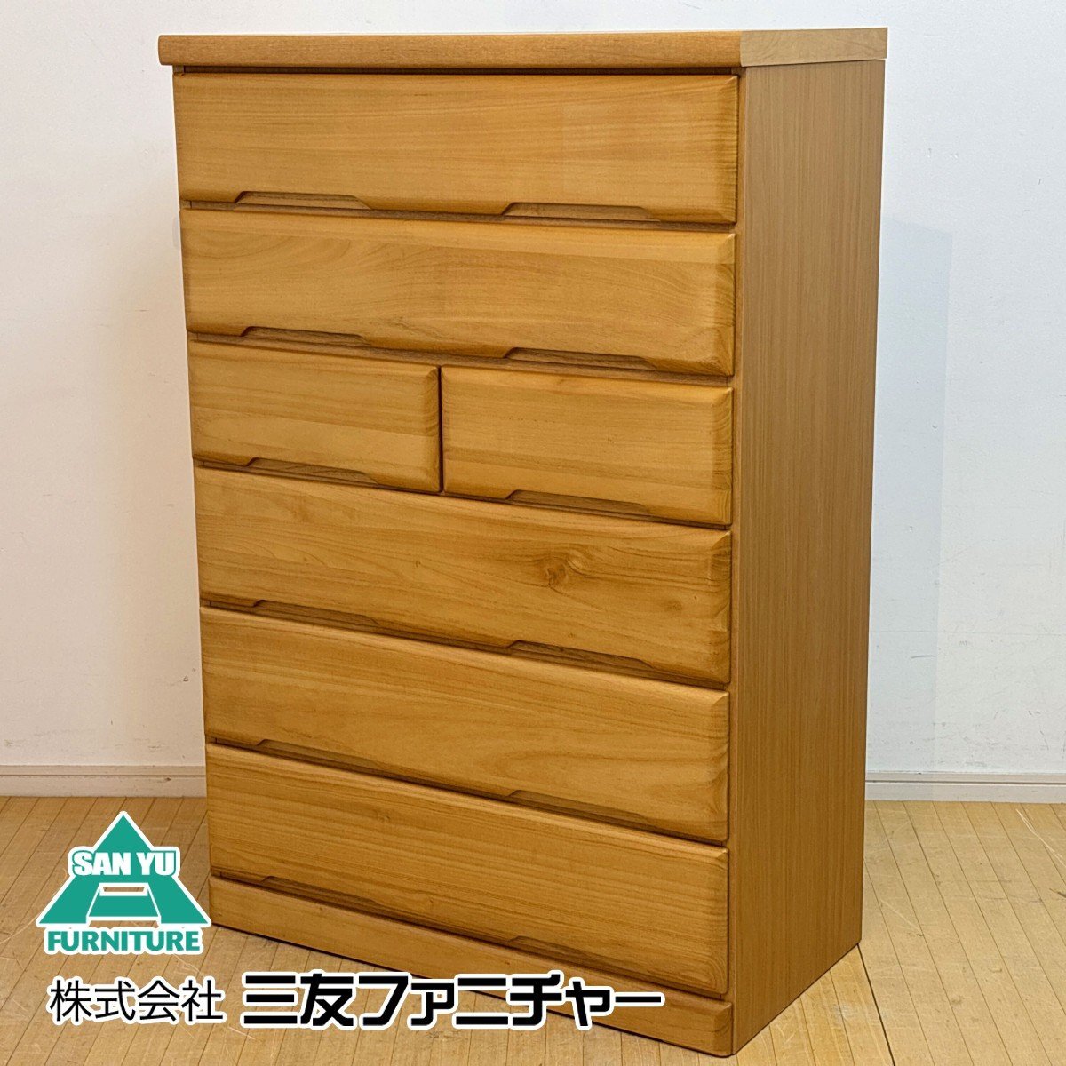 こちらは三友ファニチャー ハイチェスト です。 店頭展示に使用されていた未使用品です。 【三友ファニチャーについて】 三友ファニチャーは、昭和60年設立の佐賀県佐賀市諸富町に本社を置くメーカー。 筑後川を挟み、家具の街である福岡県大川市の隣街で、インテリアとして機能の高い商品、 特化した技術とオリジナリティで家具をすべて国内で製造・生産し、 高品質かつ低コスト、そして地球環境を意識したものづくりを心がけています。 今回は愛知県の某所の閉店した家具店より買取させていただきましたハイチェストを出品いたします。 店頭で展示されていた未使用品、いわゆる新古品とも言えるお品で、 当然一般中古のお品に比べて非常に状態の良いお品となっております。 また引出しにつきましては、横長の引出しはすべてスライドレール式となっており、 軽い力で開閉ができるため、収納物の出し入れも非常に簡単です。 その他詳細につきましては以下の画像も併せてご覧ください。 ![]() 【引出し寸法】 ![]() 【引出し寸法 配置】 ![]() 【引出し内部】 【 コンディション 】 各部の拡大やコンディションにつきましては、以下の画像も併せてご覧ください。 ![]() 状態としましては、外観上ではほとんどキズやダメージなどは見られず、 確認できたのは展示の際についたと思われる、引出しフチのわずかな剥がれ、 一部ネジ孔のささくれがある程度で基本的には未使用品らしく、 大変状態の良いお品となっております。 中古市場に流通するチェストは、どんなに丁寧に使用していたとしても、 その性質上どうしても引出しのスレや小キズなどができやすく、使用感が強いお品が一般的ですが、 今回のお品はそういったものが当然ない未使用の新古品に相当するお品ですので、 気持ちよくお使いいただける一品かと思います。 是非この機会にご検討ください! 皆様のご入札をお待ちしております。 再良市場の他のお品物はこちらから!