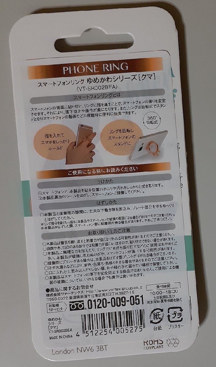 スマホリング VT-SR002BEA ゆめかわシリーズ[クマ] ヴァーテックス スマートフォン PHONE RING