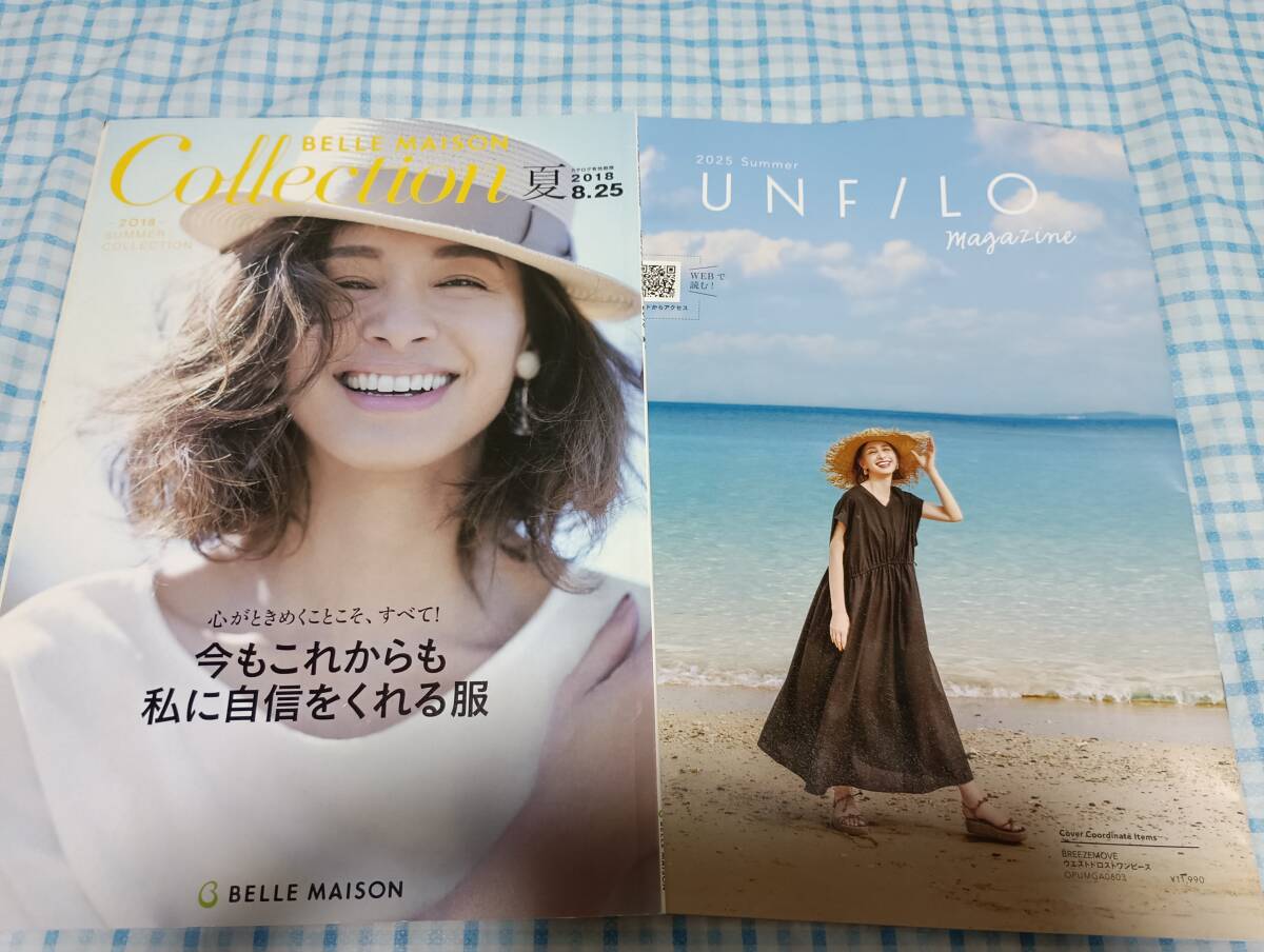 2018年ベルメゾン夏号カタログと稲沢明子2025年夏UNIFLO冊子です。稲沢明子、イーラン、加納奈々美、林田岬優などカタログに掲載です。