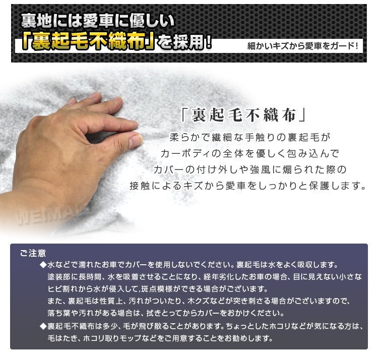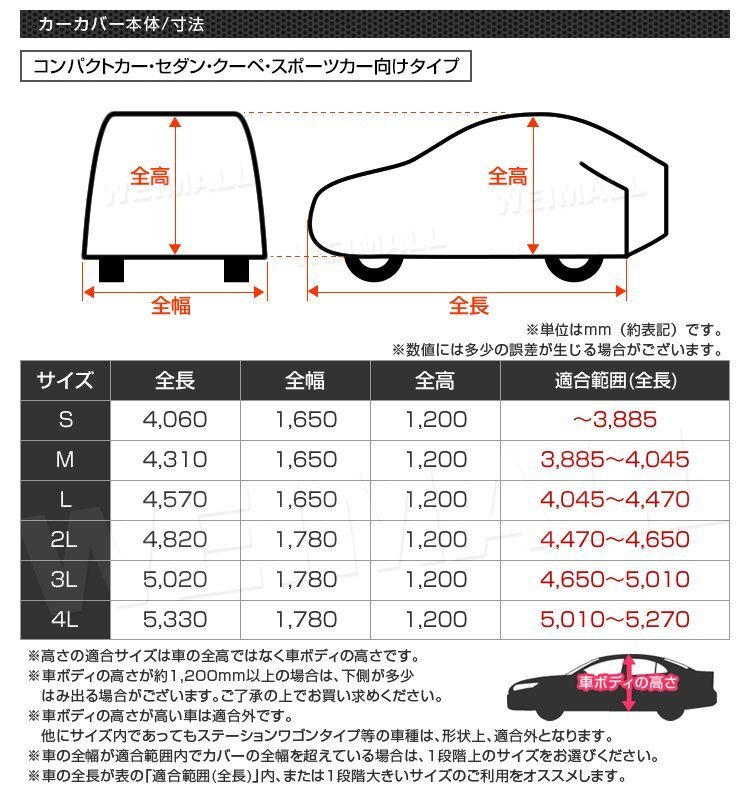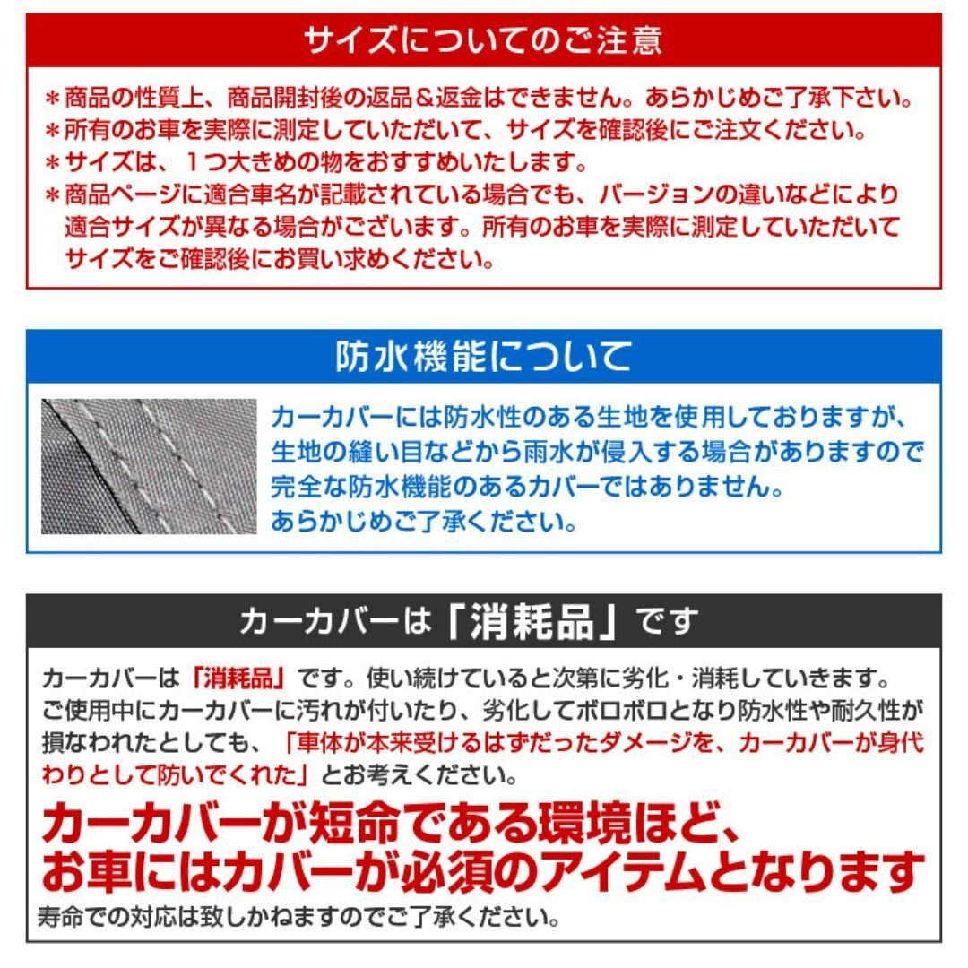 | 高品質ボディーカバーは紫外線や汚れ、鳥の糞から愛車を守ります。 表面には環境に優しいPEVA素材を使用し、UVカット加工しております。 裏面も車に優しい裏起毛不織布を使用しておりますので、愛車を傷つけること無くカバーを使用する事が出来ます! 強風防止にワンタッチベルト付きです。 カチっとワンタッチ、サクッと固定!女性ひとりでも付け外しが簡単。 また収納袋もついているので保管も簡単です。 ■商品コード:CAR150M ■商品仕様 サイズ(約):長さ431cm×幅165cm×高さ120cm 素材:PEVA、裏起毛不織布 PEVA素材とは?? ◎燃焼時に塩化水素ガスが発生しないので、環境に優しい。 ◎毒性を含まないので安心。 ◎手触りは軽くてソフトな感じです。 ◎伸びにくく切れにくい素材。 ◎防水性、防湿性に優れています。 ◎折れシワがつく。 ■注意事項 ・特殊車種や年式等によっては適応しないものがありますので、ご了承下さい。 ・適応サイズは参考サイズです。お車を実際に計測して頂き、サイズを確認の上、ご注文下さい。 (サイズ違いによる交換は致しかねます。) ・サイズギリギリですと、幅がせまくて長い車だと長さが足りなくなる場合がありますので、 少し余裕を持ったサイズをお選び下さい。 ・エアロやミラー形状などによりご利用いただけるサイズが短くなる場合もございますのでご了承下さい。 ・10年以上経過した車、再塗装済みや塗装が傷んだお車での御使用はお控え下さい。 ・入荷時期により予告無くデザインや色やサイズなど、細かな仕様が変更される場合がございます。 ・輸入品につき傷やスレなどがある場合がございます。ご了承下さい。 ・輸入品の為、外箱はありません。ご了承下さい。 ■保障期間 7日間 ※商品到着後7日以内の初期不良・破損のみご対応させていただきます。 【新品未使用品です】 |