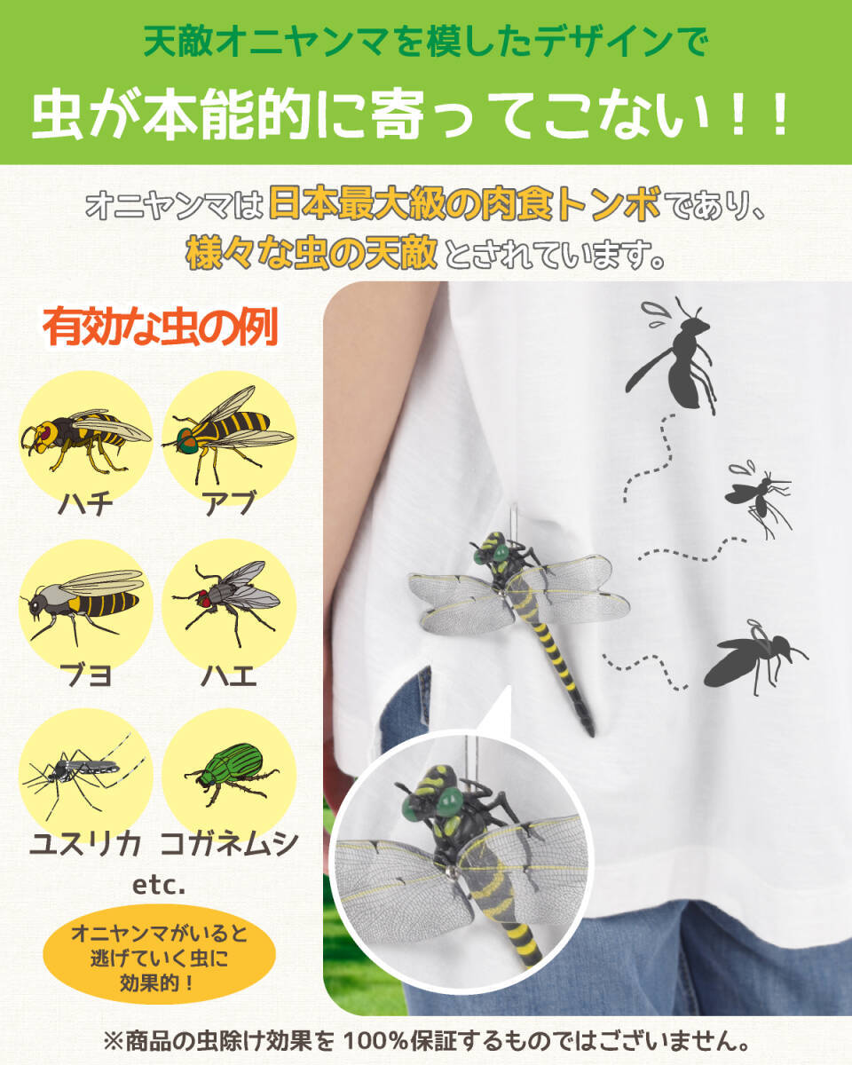 【本物そっくりなオニヤンマ】サイズは12cmで電気や薬剤を使用していないため、子供から大人まで安心 【カラビナ・ストラップ・安全ピン付き】帽子・衣類・かばんなど幅広くご使用いただけます。 【オニヤンマに逃げる虫】蚊・アブ・蜂・ブヨ・ハエ・ユスリカ などへ 【虫の侵入を防ぐ】玄関・網戸・車内などの虫に侵入対策に 【虫被害を防ぐ】川釣り、キャンプ、ハイキング、バーベキュー、家庭菜園など虫の多いアウトドア活動で大活躍