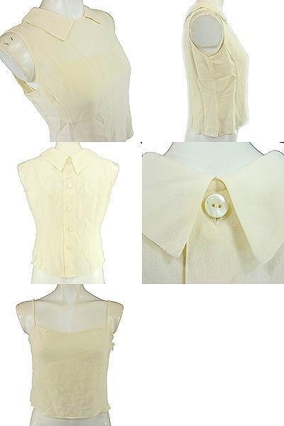 | シルク素材の高級感のあるアンサンブル。 シャツは後ろボタン開き、キャミソールはサイドファスナー開きタイプになります。 透け感のある素材が軽やかな印象です。 パンツでもスカートでも合わせて頂けますよ。 トップス:肩幅約30.5cmバスト約86cm着丈約42cm キャミソール:バスト約80cm身丈(背中から)約25cm 【サイズ】:(40) 【素 材】:(絹100%) 【 色 】:(オフ白) 【程 度】:(B) 管理番号 8528-20101013-003 101 023 | ||||