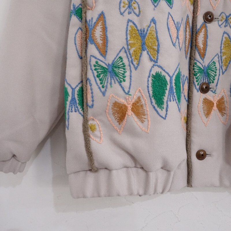 | 2024年AWコレクションmina perhonenのsky flower 刺繍中綿ブルゾンです。カラーはライトグレージュ(表記:ベージュ)ベースにカラフルなチョウチョの刺繍入りの中綿素材で、ブラウンのボアのパイピングが施されております。フロントボタン開閉で着脱でき、裾はゴム入り、両腰にポケット付きです。子供用アイテムで、定価(メーカー希望小売価格)48,400円 税込みの商品です。 |