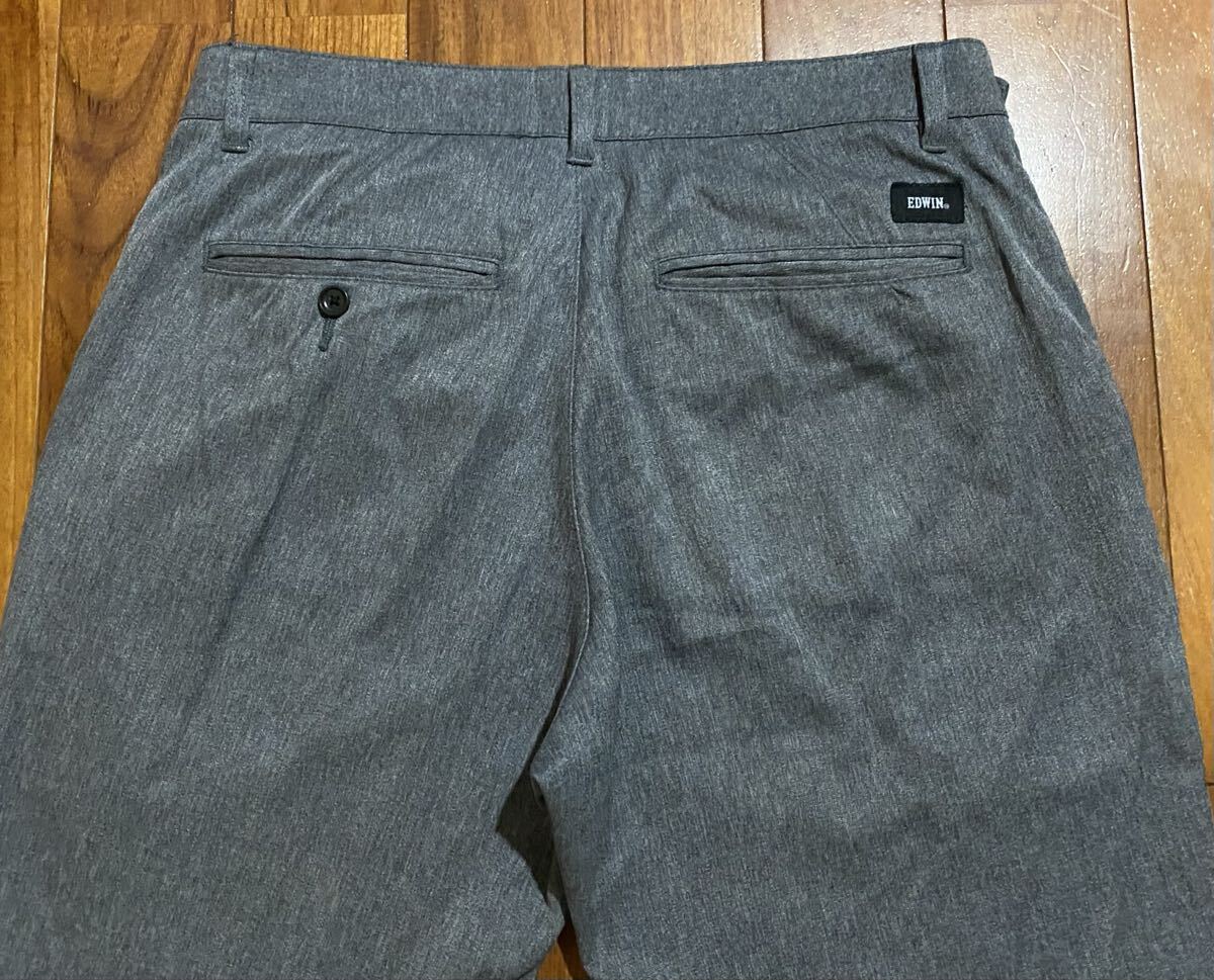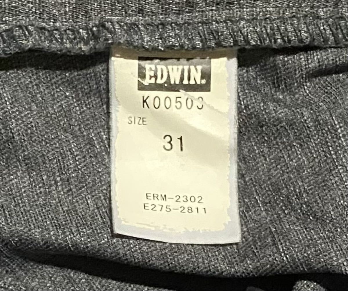 エドウィンのストレッチパンツ、K00503です。USEDですが状態は良いです(10段階中8程度)。生地はストレッチ入りでポリエステル96%、ポリウレタン4%です。ジッパーフライです。正規品です((株)エドウイン、中国製)。サイズはW31でウエストは重ねずに平置きで約81cm、ヒップ約114cm、股上約27cm、股下約77cm、股下15cmのふともも部分約57cm、裾まわり約42cm、重量約430gです。発送はゆうパケットポストになります。