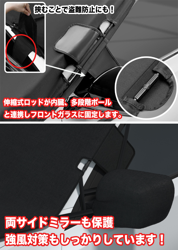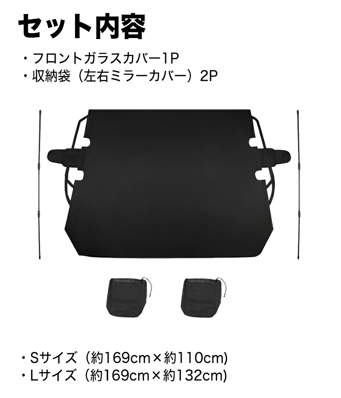 | 冬は霜、凍結を防止することが可能で夏は直射日光を遮断することができ、 大変重宝するアイテムです!! キャンプ、アウトドア、車中泊にも日除けのカーテン代わりとしてご活用頂けます!! ■サイズ ・Lサイズ:幅(長辺)約169cm×高さ約132cm ■セット内容 ・フロントガラス凍結防止カバー×1 ・サイドミラー用カバー×2 ※折りシワが付いている場合がございます。 |