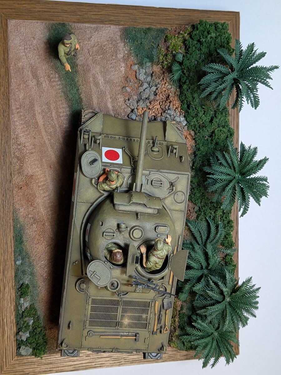 ・アクセスしていただき、誠にありがとうございます。・出品物はタミヤ1/35スケールのシャーマン戦車をメインにしたジオラマで、タイトルは「Crash!!(クラッシュ)」です。・とある南方戦線で無敵シャーマンを鹵獲した日本陸軍戦車隊でしたが、意気揚々と最前線に向かう道すがら、運転ミスで側壁に突っ込んでしまいクラッシュ。履帯が切れてしまいブチギレた車長に操縦手が両手を合わせて謝っているところを再現したもので、シャーマン戦車が自衛隊の前身である警察予備隊に配属された際、アメリカ人規格のため小柄な日本人の体格に合わず、ペダルに足が届かず苦労したと言う逸話からイメージを膨らませて製作しました。・発送はゆうパック(80サイズの予定)です。発送に際し、しっかり梱包させていただきますが、ちょっとした破損は落札者さまで修理をお願いいたします。ただし、破損の程度によっては誠意をもって対応いたしますのでご安心下さい。・ノークレーム&ノーリターンなので出来栄えを写真で確認した後、ご入札ください。・業者様のご入札はご遠慮下さい。業者様が落札された場合は理由の如何を問わず、落札者都合でキャンセルとさせていただきますのでご注意ください。・入札のご検討をよろしくお願いいたします。