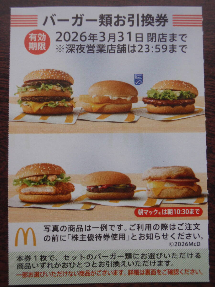 | 商品説明 | ●日本マクドナルドホールディングス(株)の株主ご優待バーガー類お引換券の10枚セットです。 ●本券1枚で、セットのバーガー類にお選びいただける商品いずれかおひとつとお引換えいただけます。(数量限定商品など、一部の商品ではご利用になれない場合があります。) ●有効期限は2026年3月31日までです。 ※デリバリーサービス、モバイルオーダー、セルフオーダーキオスクでは利用できません。 |