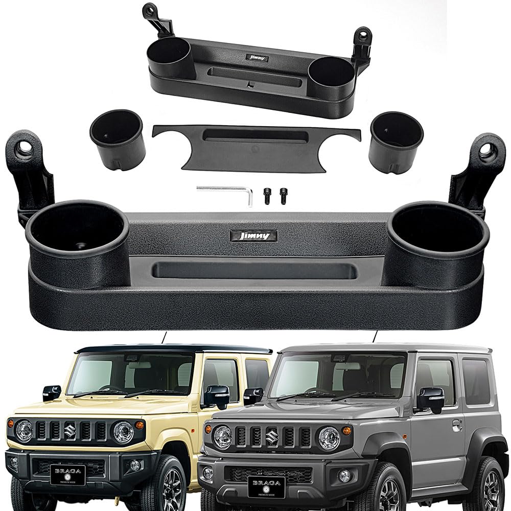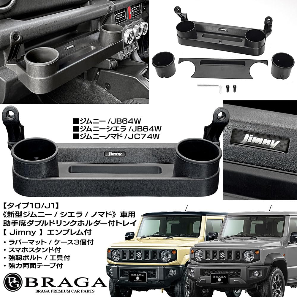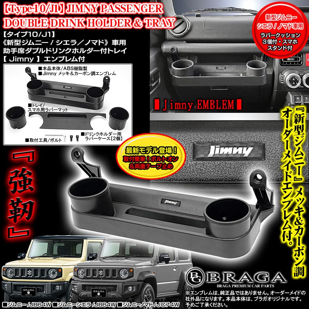 《タイプ10/J1》【Jimny エンブレム付/ 新型ジムニー/シエラ/ノマド車用 JB64W JB74W JC74W】助手席用ダブル ドリンクホルダー付多目的トレイ/滑り止めラバーケースマット付/ABS樹脂製/スマホ スタンド/吊下げフック付/多機能で優れた収納トレイ/客注品 欧米仕様/ブラガ