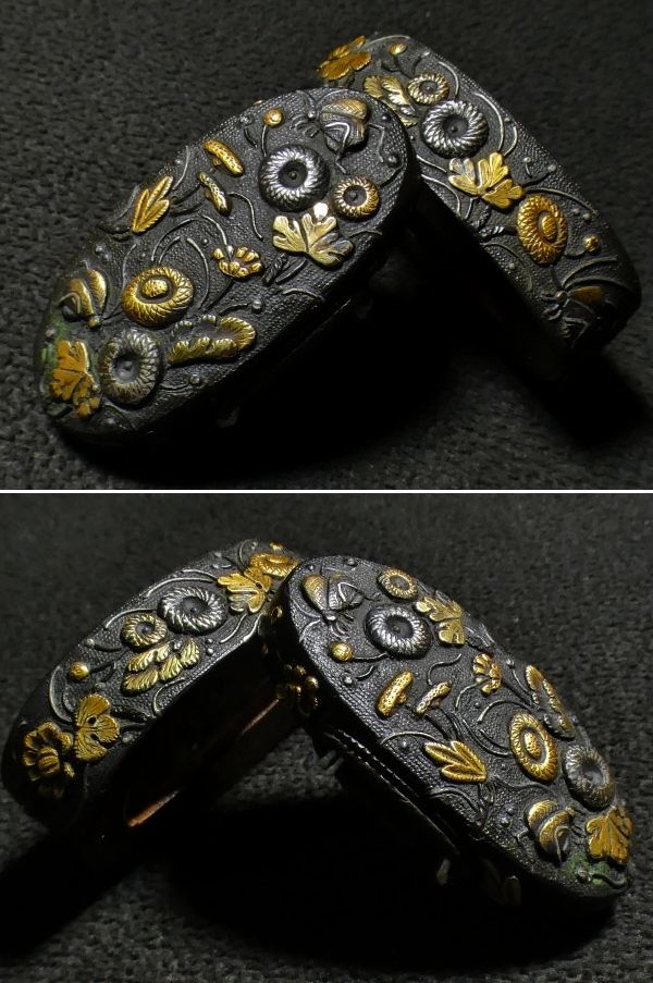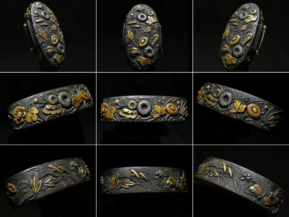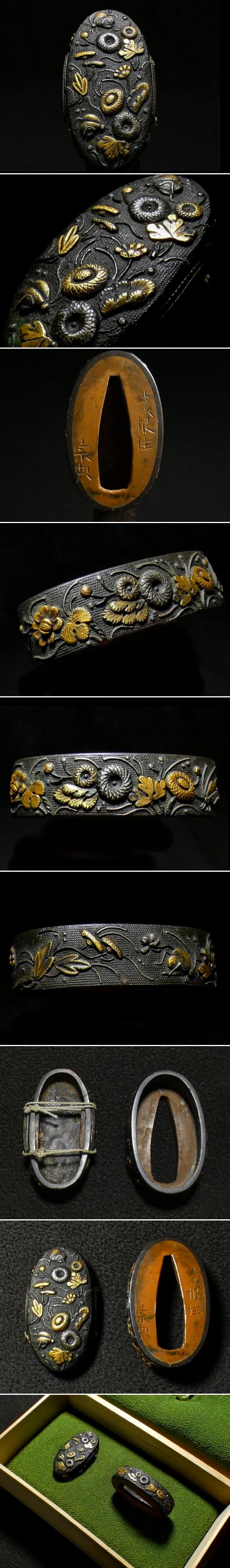 | 商品説明 | 華やかな金銀象嵌色絵に加え 雰囲気良き繊細な菊花図の施された 「彦根住 宗典」 在銘の見栄え良き一品です。 彦根の見栄え良き作品をお探しの方 この機会に是非手に入れて下さい。 【繊細な細工技術】 【鮮やかな菊花図】 【拵え栄えする一品】 寸法: (縁) 約 3.84cm × 約 2.37cm × 約 1.06cm (厚み) (頭) 約 3.82cm × 約 1.96cm × 約 0.80cm (厚み) 時代: 江戸時代 材質: 赤銅魚々子地 桐箱付 銘 : 彦根住 宗典 状態:鑑賞を損なう大きな傷みはなく概ね良好。 多少の表面の荒れくらいはございます。 画像にてご判断下さい。 :許容範囲内の時代傷みはご理解下さい。 |