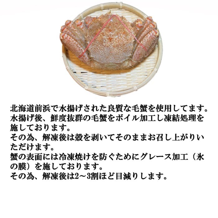 水揚げされた良質な毛蟹を鮮度抜群のままボイル加工し凍結致しておりますので