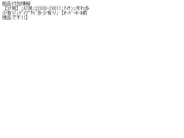 | 備考 | ジャンク品!!;AT用;22030-28011;アイサン;汚れ多少有り;パイプサビ多少有り;【オーバーホール前提品です!!】 | ||||