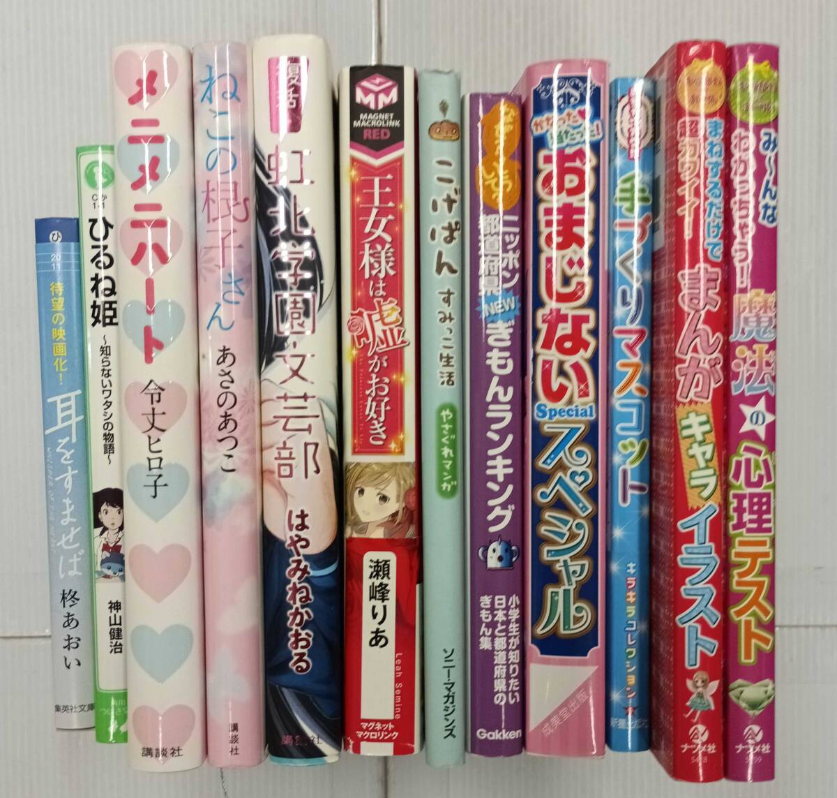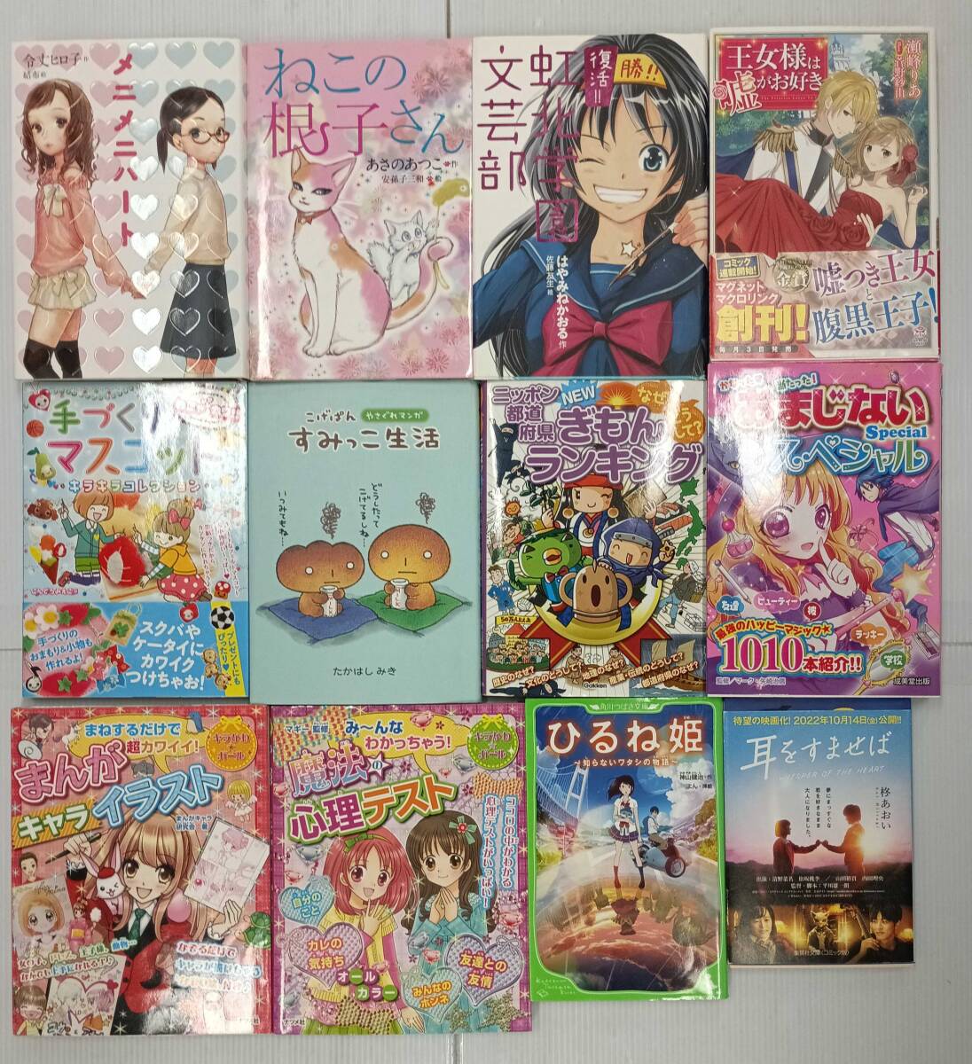 | 【タイトル】 | 在庫処分!! 女児におすすめな本 12冊まとめ売り メニメニハート ねこの根子さん 復活!!虹北学園文芸部 王女様は嘘がお好き 耳をすませば ひるね姫~知らないワタシの物語~ なぜ?どうして?ニッポン都道府県ぎもんランキング めちゃカワ!!手づくりマスコット こげぱん やさぐれマンガ すみっこ生活 かなった当たった!おまじないスペシャル まねするだけで超カワイイ!まんがキャライラスト み~んなわかっちゃう魔法の心理テスト |