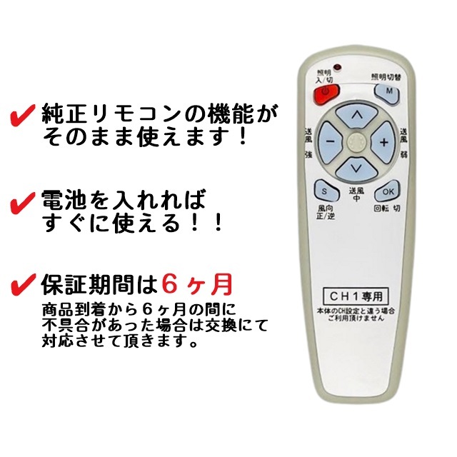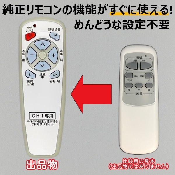 | 【商品名】 plus more BIG-101 (CH1) 代替リモコン 【対応機種】 純正リモコンに「CH1」のシールが貼られている商品専用です。 「CH1」以外では動作しません。 BIG-101 BIG-102 比較画像の右側の純正リモコンが付属する機種に使用出来ます。 上記機種以外については、質問欄よりメーカーと型番をご連絡頂ければ、対応品のご案内をしております。 【商品について】 左側の代替リモコンが出品物になります。右側のリモコンは見本画像です。 タイトル機種のリモコン信号を入力した、設定不要で使える純正品と同等の代替リモコンです。 乾電池は付属しません。別途ご用意下さい。(単4乾電池×2本) 【商品サイズ】 縦11.7cm×横3.9cm×高さ1.9cm 【発送について】送料無料 迅速発送を心掛けております。土日祝日はお時間を頂く場合ございます。 ポスト投函配達となり、日時指定は出来ません。 | ||