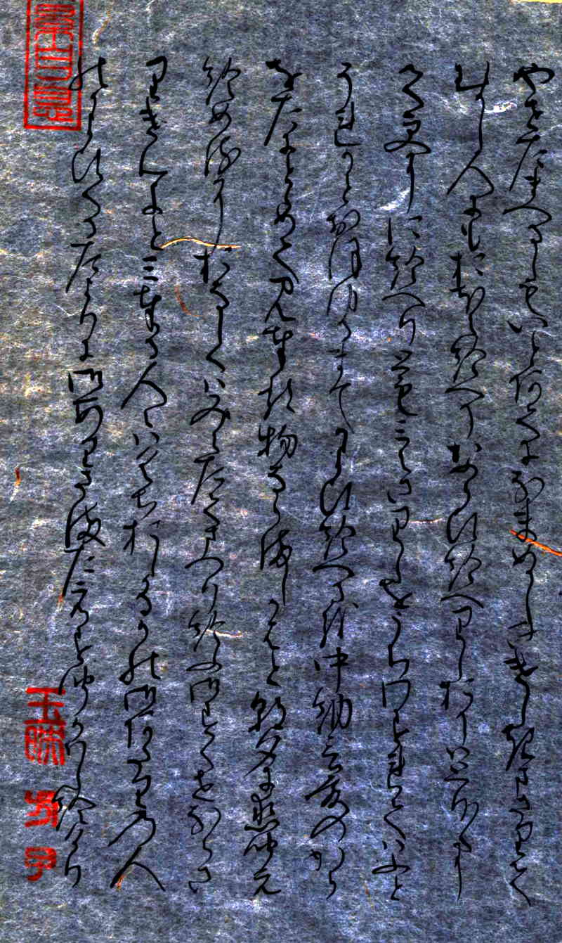 「早蕨(さわらび)」自筆原本上部には、「心寧累自息」《心寧(やすければ)累(るい)も自(おのずか)ら息(や)む》という漢文の篆書印が押捺されている。白楽天の有名な漢詩です。言葉の意味は、「心安らかならば煩(わずら)いも自然に消える」という内容です。紫式部がこの原詩に親しんでいたことがわかる。