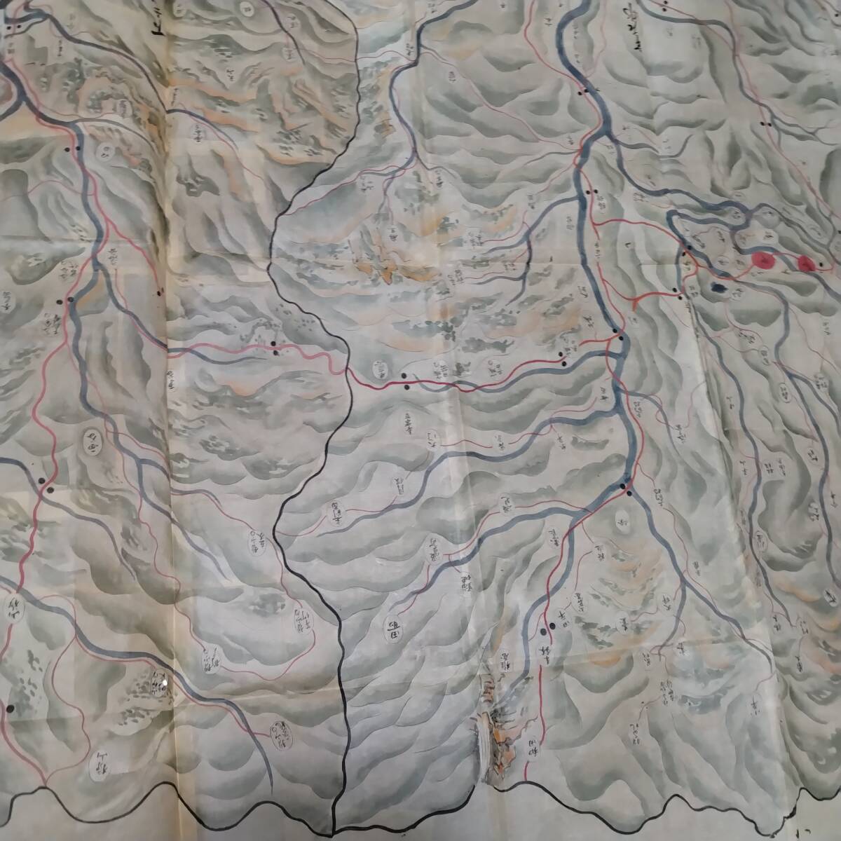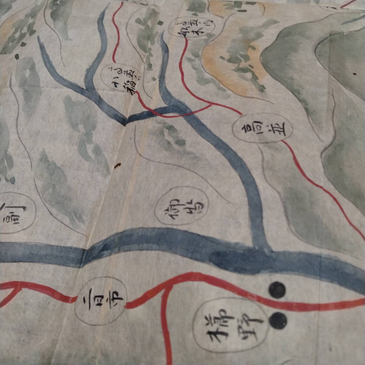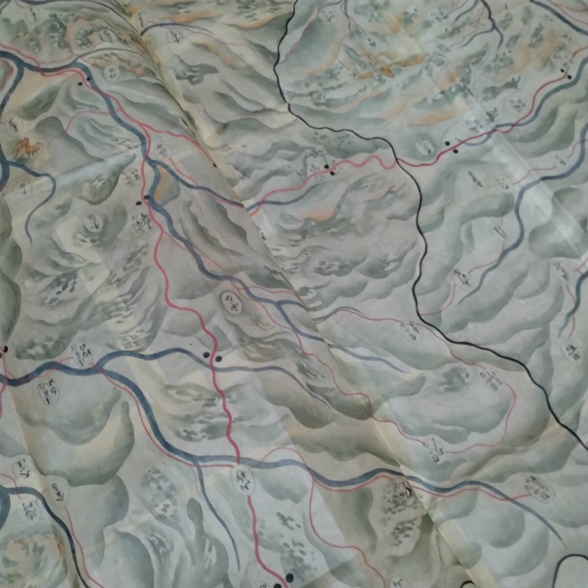 当方の先祖より代々受け継がれ曽祖父蔵にて保管されておりました。曽祖父から祖父、父へと渡り当方が譲り受けました。本来ならば手放すものではなく重要文化財類の歴史的な逸品です。私の家系の家宝です。博物館より数度に渡り貸出展示依頼もございましたがお断りさせて頂いておりました。約205×147と2枚が一つに連なり彩色美麗、誠に貴重な絵図です。お詳しい方、歴史関係に携わっております方ならなおのこと価値を見いだしていただけるかと存じます。