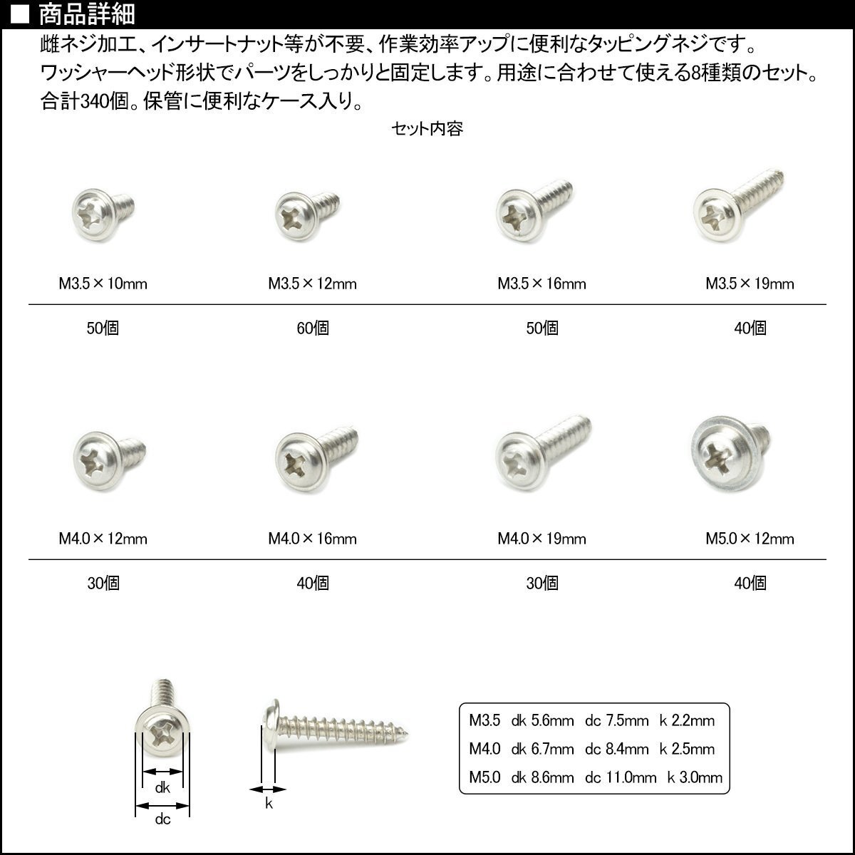 雌ネジ加工、インサートナット等が不要、作業効率アップに便利なタッピングネジです。 ワッシャーヘッド形状でパーツをしっかりと固定します。 用途に合わせて使える8種類のセット。 合計340個。保管に便利なケース入り。 | ■ ステンレス製 ナベワッシャーヘッド タッピングネジ 8種セット ■ セット内容 ・M3.5×10mm 50個 ・M3.5×12mm 60個 ・M3.5×16mm 50個 ・M3.5×19mm 40個 ・M4.0×12mm 30個 ・M4.0×16mm 40個 ・M4.0×19mm 30個 ・M5.0×12mm 40個 合計340個入り ■ 保管に便利なケース入り その他のネジは⇒ こちら | |