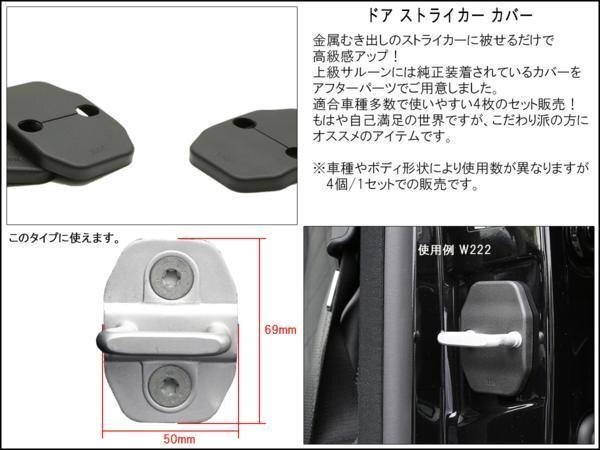 金属のむき出しのストライカにか被せるだけで高級感アップ! 一昔前は付いてて当たり前でしたが、最近では上級サルーンでも付いていない車種もチラホラ見かけます。 無くても気になりませんが、一度取り付けると無しでは居られない!? 錆や腐食防止にも一役かってくれるお勧めパーツです。 | ■ ストライカーカバー ■ ベンツ 汎用 ■ 素材:PP ■ 入数:数量1で4枚セット 4枚セットです。2枚しか使わない車種では2枚余ります。予備にお持ち頂くか友人と分け合って下さい。 適合記載車種以外にも多車種に使用可能です。サイズを目安に車輌側を確認してみて下さい。 その他、ベンツ用パーツは⇒ こちら | |
