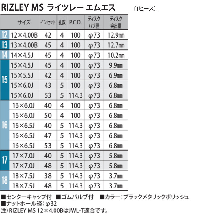 ◆ホイール : RIZLEY MS ◆カラー : ブラックメタリックポリッシュ ◆ホイールサイズ[インチ/リム幅/インセット/穴数/P.C.D.] ◇16インチ 6J+40 4H-100 ★ホイール単品 1本 |