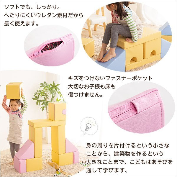 【ポイント】 こどもの遊び心と発想力が育つ積み木クッション8個セット! パーツが豊富なので、お気に入りの形を見つけて楽しく遊んで頂けます。 PVC生地を使用しており、水や汚れに強いので安心してお使い頂けます。 中材はヘタリにくいウレタン生地の為、強度に問題ありません。 |