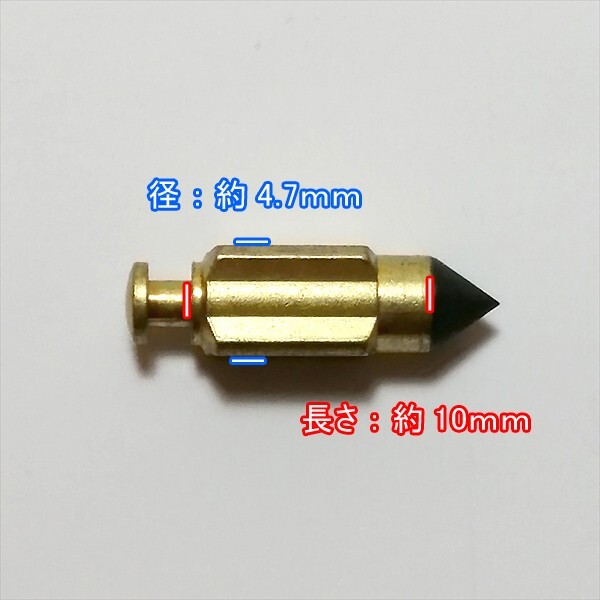 ■フロートニードルバルブ 純正パーツ 未使用品です。 ■少し古い形式の管理機やガソリンエンジンのキャブレターに多く使用されています。 形状やサイズが合えばその他のキャブレターでも使用できます。 ■キャブレターへのガソリンの侵入量を制御する部品です。 キャブレターからのオーバーフロー(漏れ)が止まらないときは この部品を交換すると改善することがあります。 ※同型の機種でも形状が違う場合があります。画像にてよくご確認ください。 ■サイズ ・本体胴部長さ:約10mm ・径:約4.7mm ■お使いのモニターや照明器具等で実際の色とは若干異なって見える場合もございます。多少の誤差はお許し下さい。 ■写真に掲載のもの以外は原則付属致しませんのでご注意下さい。 ■キャブレター周辺部品は