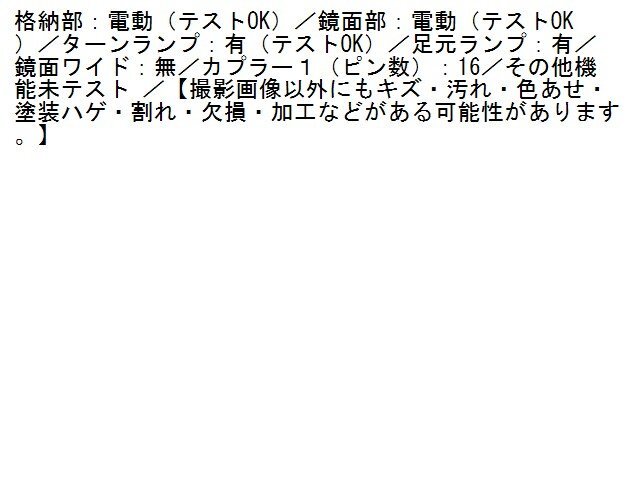 | 商品情報 | 格納部:電動(テストOK)/鏡面部:電動(テストOK)/ターンランプ:有(テストOK)/足元ランプ:有/鏡面ワイド:無/カプラー1(ピン数):16/その他機能未テスト /【撮影画像以外にもキズ・汚れ・色あせ・塗装ハゲ・割れ・欠損・加工などがある可能性があります。】 | ||