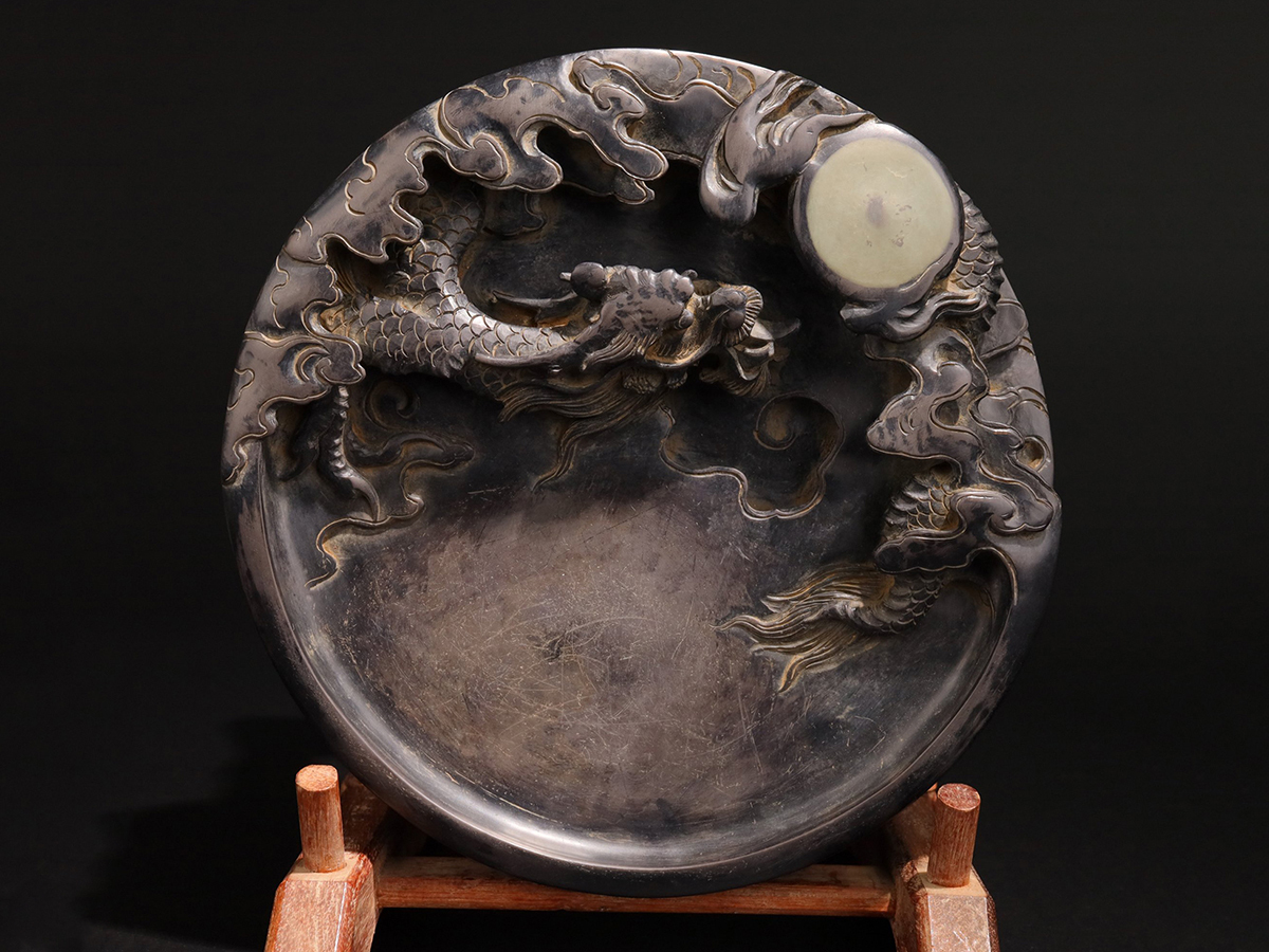 ◆御泓軒◆『清朝時代 老坑端硯 神龍戯珠紋端渓硯 李光庭銘』極細工・古賞物・中国古玩・中国古美術