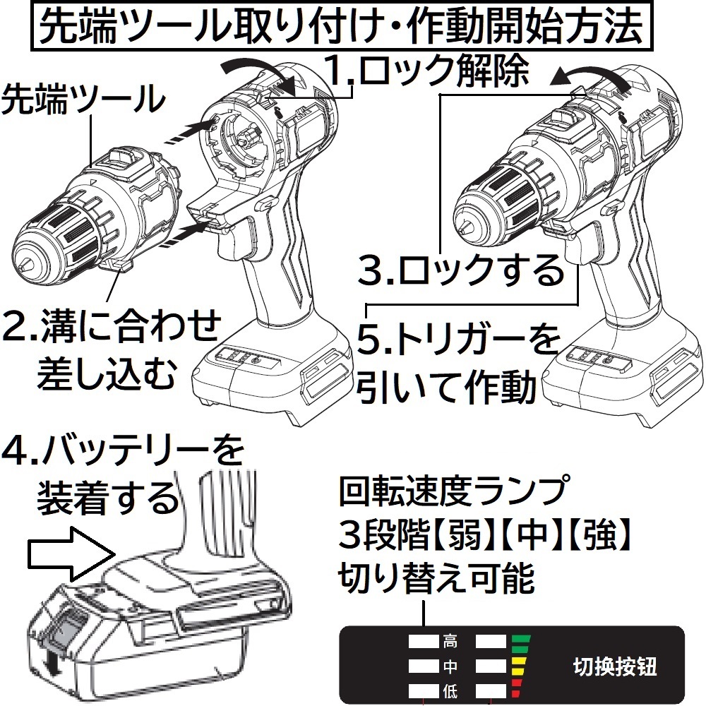 | 説明書 | 取扱説明書は付属しておりませんので、【 YouTube 】電動工具の部屋・TANACHIIチャンネル⇒動画のバナーをクリック(タップ)して、商品説明動画を参考にして下さい。 |
